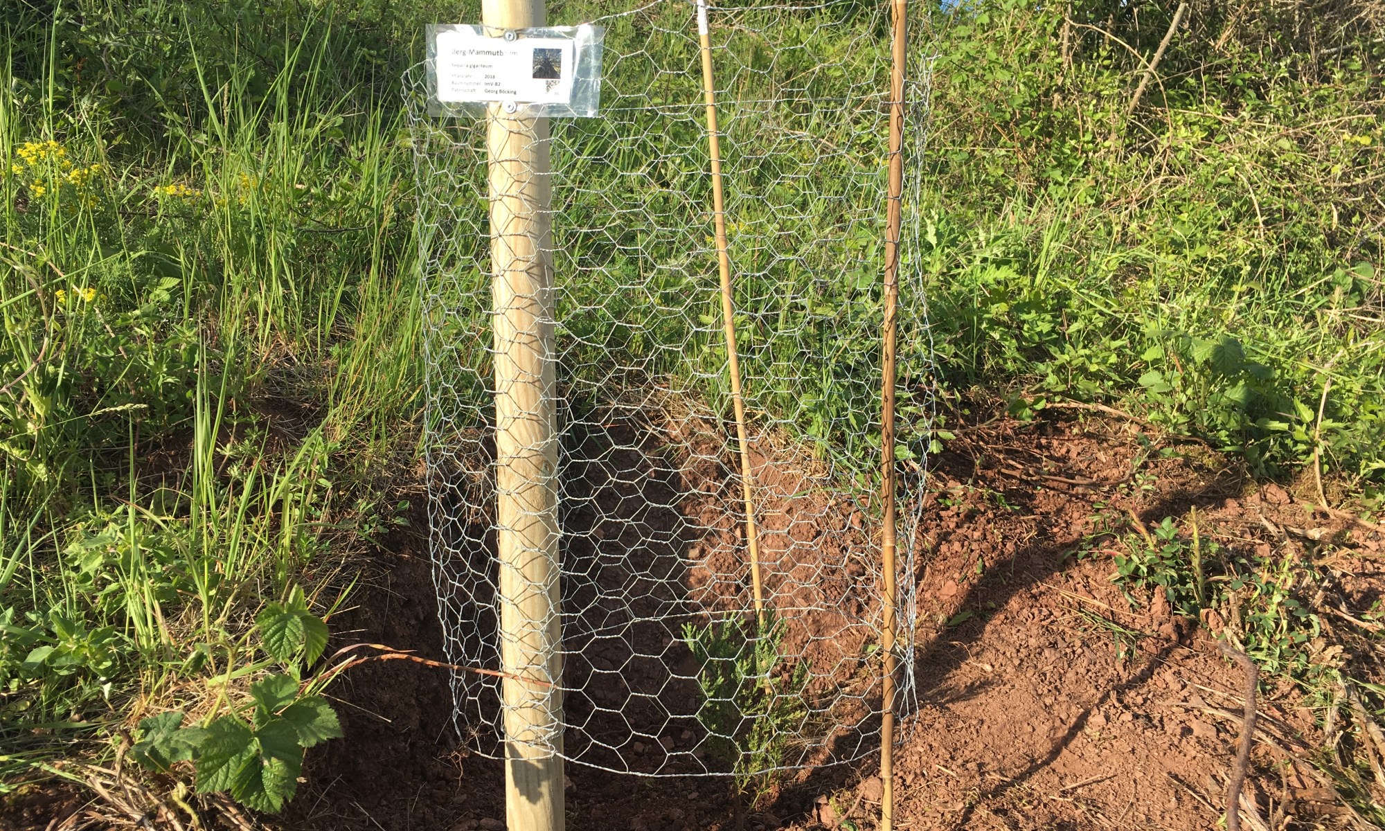 2018-09-29: Frisch aus der Baumschule geliefert, musste er gestern noch für einen Videodreh herhalten. Jetzt darf der kleine sich in unmittelbarer Nachbarschaft zu seiner Filmpartnerin in frischer Pflanzerde entspannen und hoffentlich sehr bald zu einem „Big Schorsch“ heranwachsen.