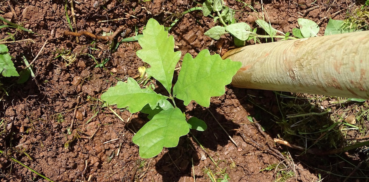 2019-06-29: Entdeckt von der Baumpatin während einer Hirschkäfer-Pirsch in Horbach im schönen Naturpark Spessart, wurde die frisch gekeimte Eichel in einem Akt der Barmherzigkeit vom Waldweg aufgelesen und darf nun groß und stark werden in einem Eichen-Hirschkäfer-Projekt im ebenfalls sehr schönen Naturpark Soonwald-Nahe.