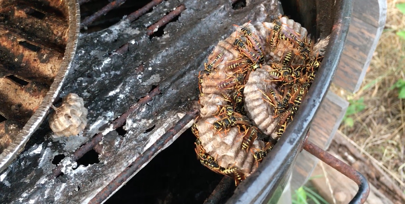2018-08-08: Die Natur ist der beste Baumeister und versteht sich darauf, von Menschen gemachte Kulturlandschaften – oder wie in diesem Falle Kulturgüter – sich zu Nutze zu machen. In diesem Fall weder die „Gemeine“, noch die „Deutsche“, sondern eine sehr friedliebende Wespenart, die sicher niemanden beim Grillen stören würde: Willkommen im „Grillhotel Im Naturgarten“!