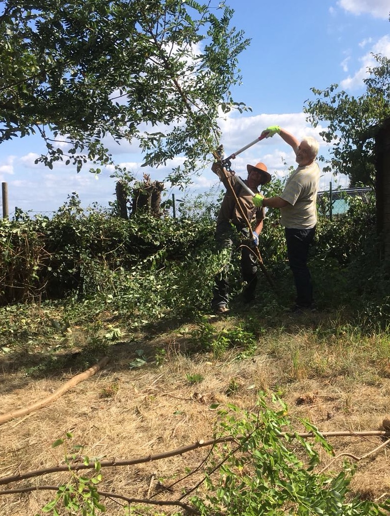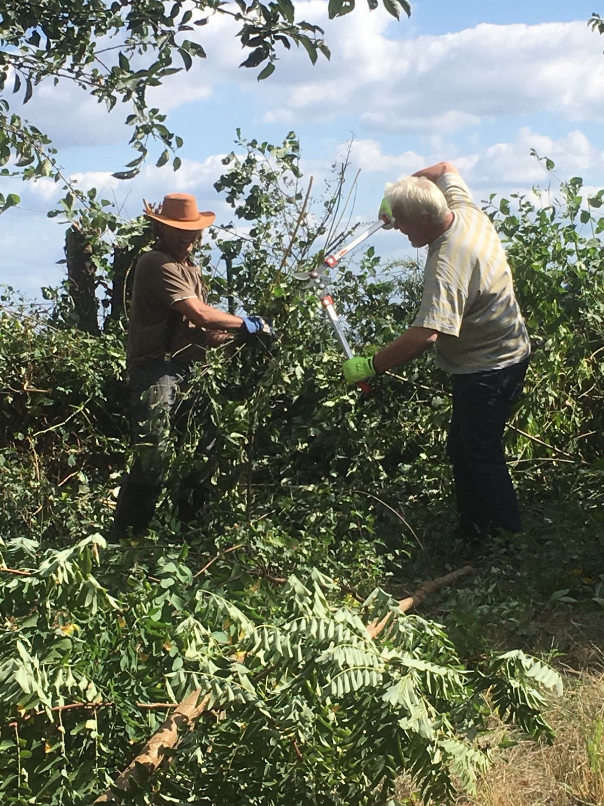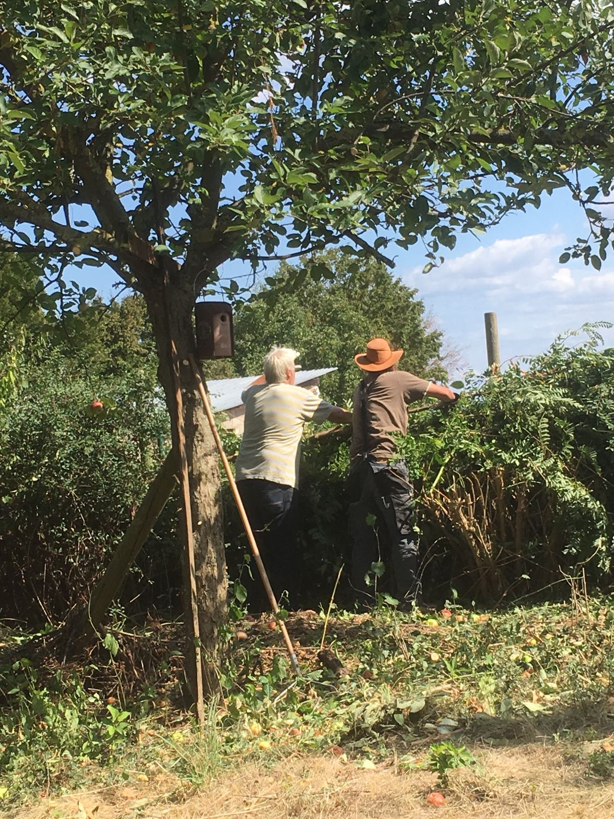 2018-09-01: In der Hitze des Spätsommers sind Verpächter und Pächter tatkräftig bei der „Entbuschung“ auf der Hochstamm-Obstwiese, zur Vorbereitung der Bienenweide im kommenden Frühjahr, und „Aufbuschung“ in den Randbereichen, um Insekten und Kleinsäugern, wie zum Beispiel dem Igel, ein Quartier für den Winter zu bieten.