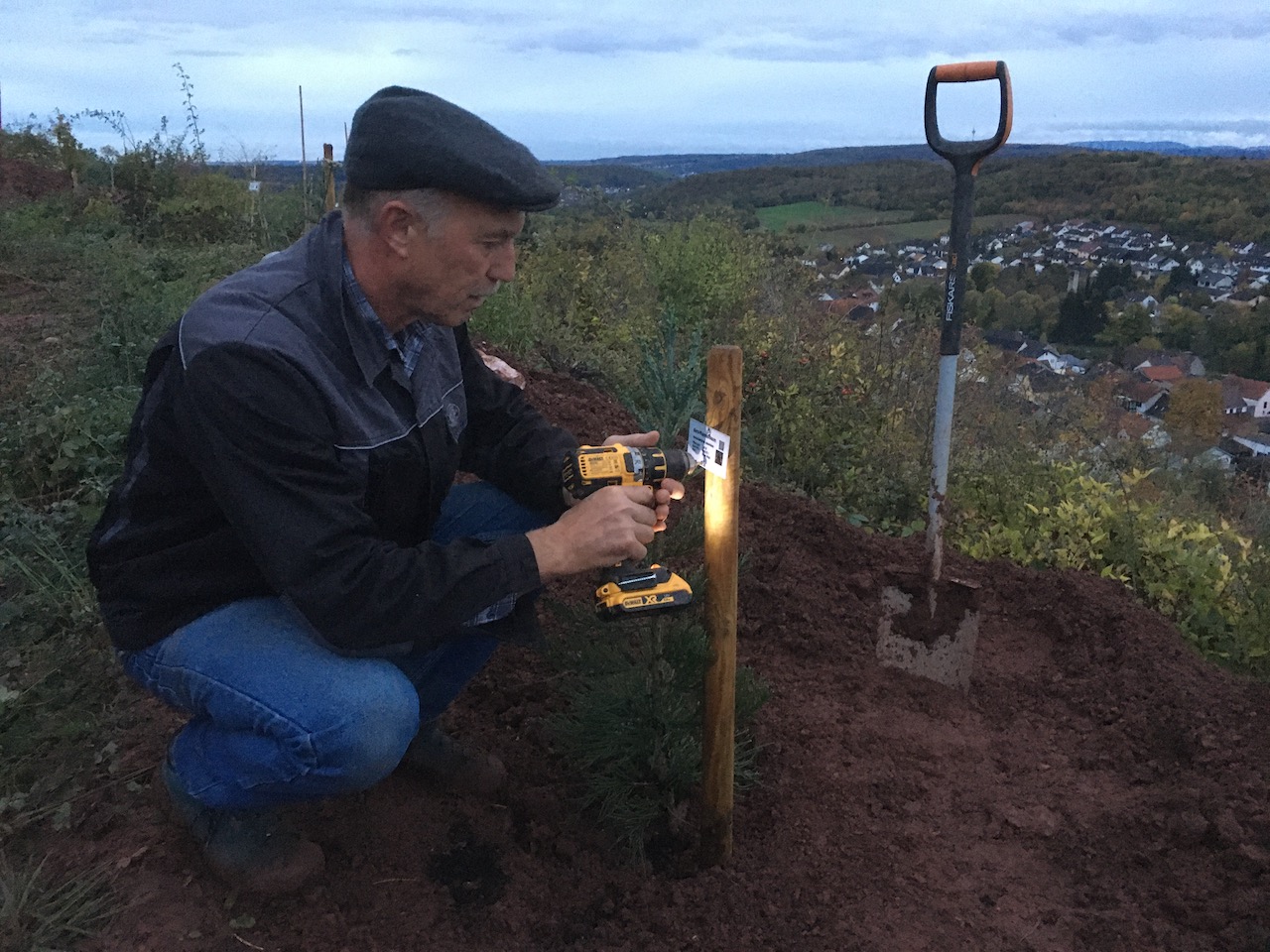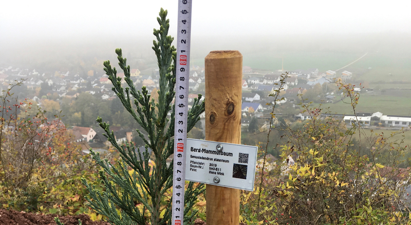 2019-11-03: Vom Paten und Mammutbaum-Freund bei der Pflanzparty liebevoll in die Erde befördert mit einer Höhe von 86 cm. Einer der wenigen Bäume, die an diesem Tag gleich ihr Schildchen mitbekommen haben.