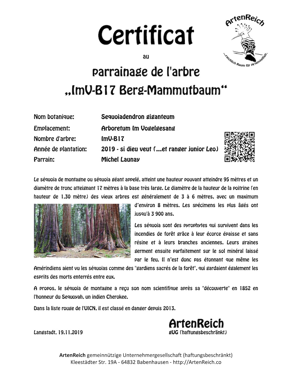 2019-11-19: Patenschaft für Baumnummer B17 zum 77. Geburtstag geschenkt und vom Enkel und Junior-Ranger ins Arboretum gepflanzt.