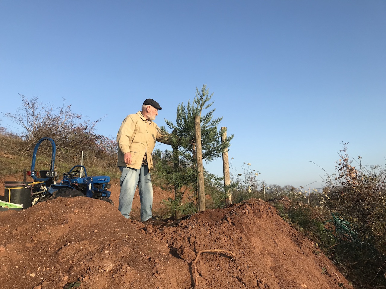 2019-12-05: Quasi als Trostpflaster für einen kürzlich gefällten Baumriesen, wurde dem Mammutbaum-Liebhaber, der ihn vor über 30 Jahren pflanzte, eine Ersatzpflanze geschenkt. Mit 190 cm damit der bislang größte Berg-Mammutbaum im Gutenberger Arboretum.