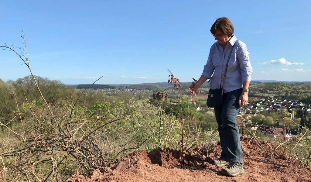 2020-04-10: Als letzter Pflanz-Akt des Karfreitag-Triathlons im Zeichen der Farbe Rot, durfte der Rot-Ahorn als erster Baum in das frisch erschlossene neue Areal, namens Ahorn-Schnecke einziehen.