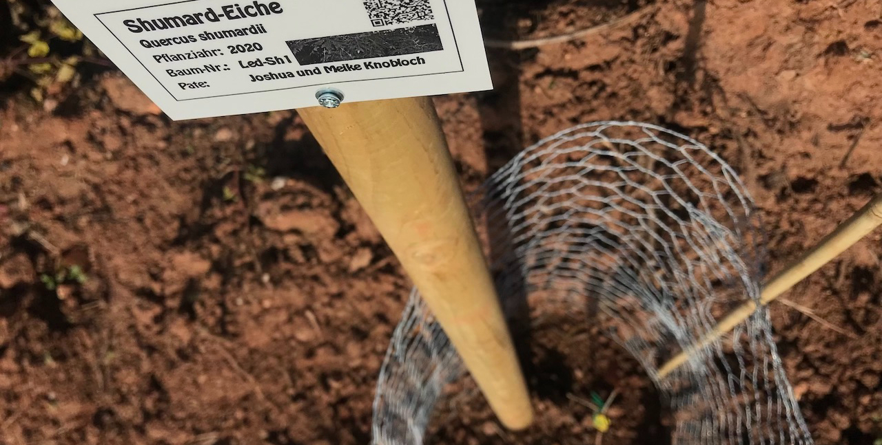 Nicht zufällig wurde der Platz für die Shumard-Eiche im höher gelegenen Bereich der Hirschkäfer-Lederhose ausgesucht. Sie ist extrem hitze- und trockenheitstolerant und sollte daher mit diesem sonnigen und windexponierten Standort keinerlei Probleme haben. Und wenn die Paten-Eiche der Mutter gleich nebenan steht, dann kann eigentlich absolut nichts mehr schief gehen 😉