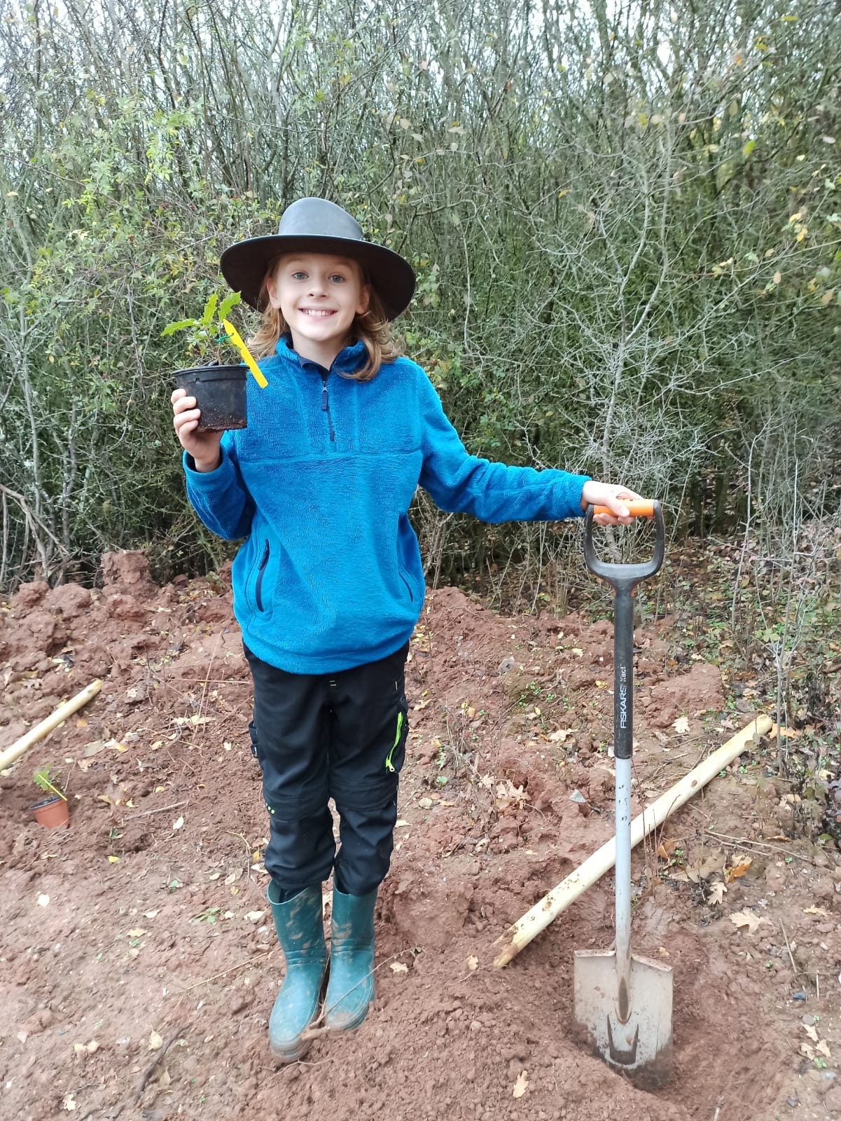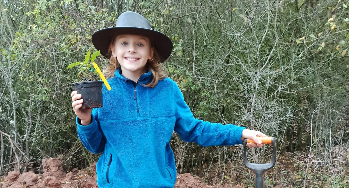 2020-11-01: Zwei Junior Ranger pflanzen die erste Kastanienblättrige Eiche in die Lederhose und übernehmen gleich die Baum-Patenschaft.