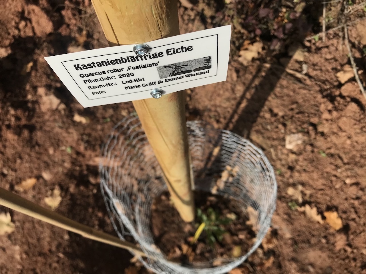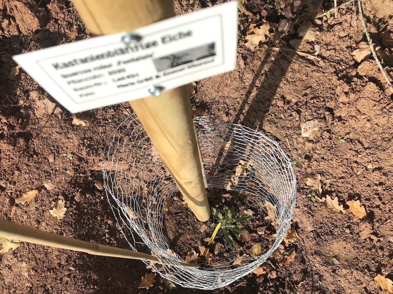 Die Eiche wurde in der ArtenReich-Baumschule aufgezogen und stammt von einem Baum ab, der in Frankfurt neben der Kreditanstalt für Wiederaufbau steht.