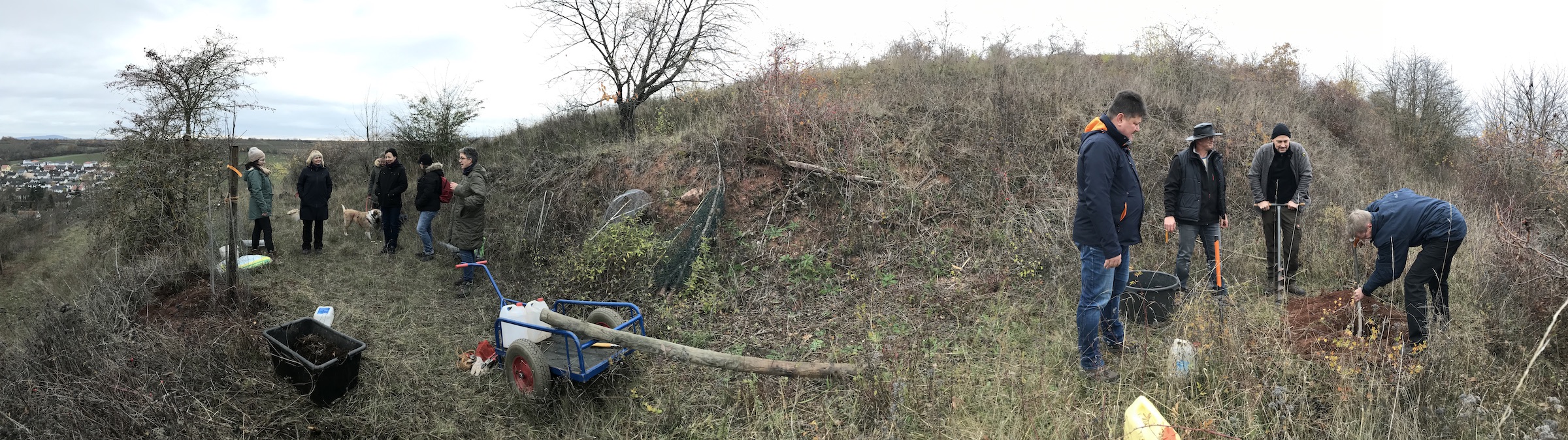 2020-11-22: Während die Frauen sich bei ihrem Birnbaum schon ausruhen können vom anstrengenden Zuschauen, heißt es bei den Männern „auf zum nächsten Pflanzloch“.