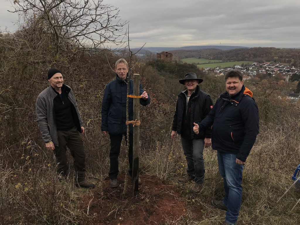 Gegraben, gebohrt, gerammt, gepflanzt. Jetzt heißt’s nur noch ein paar Jährchen warten, bis man gemeinsam lustvoll in den ersten Knorzekopp beißen kann – also jeder in seinen eigenen Apfel… ist zu hoffen.