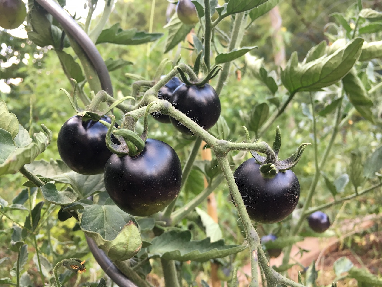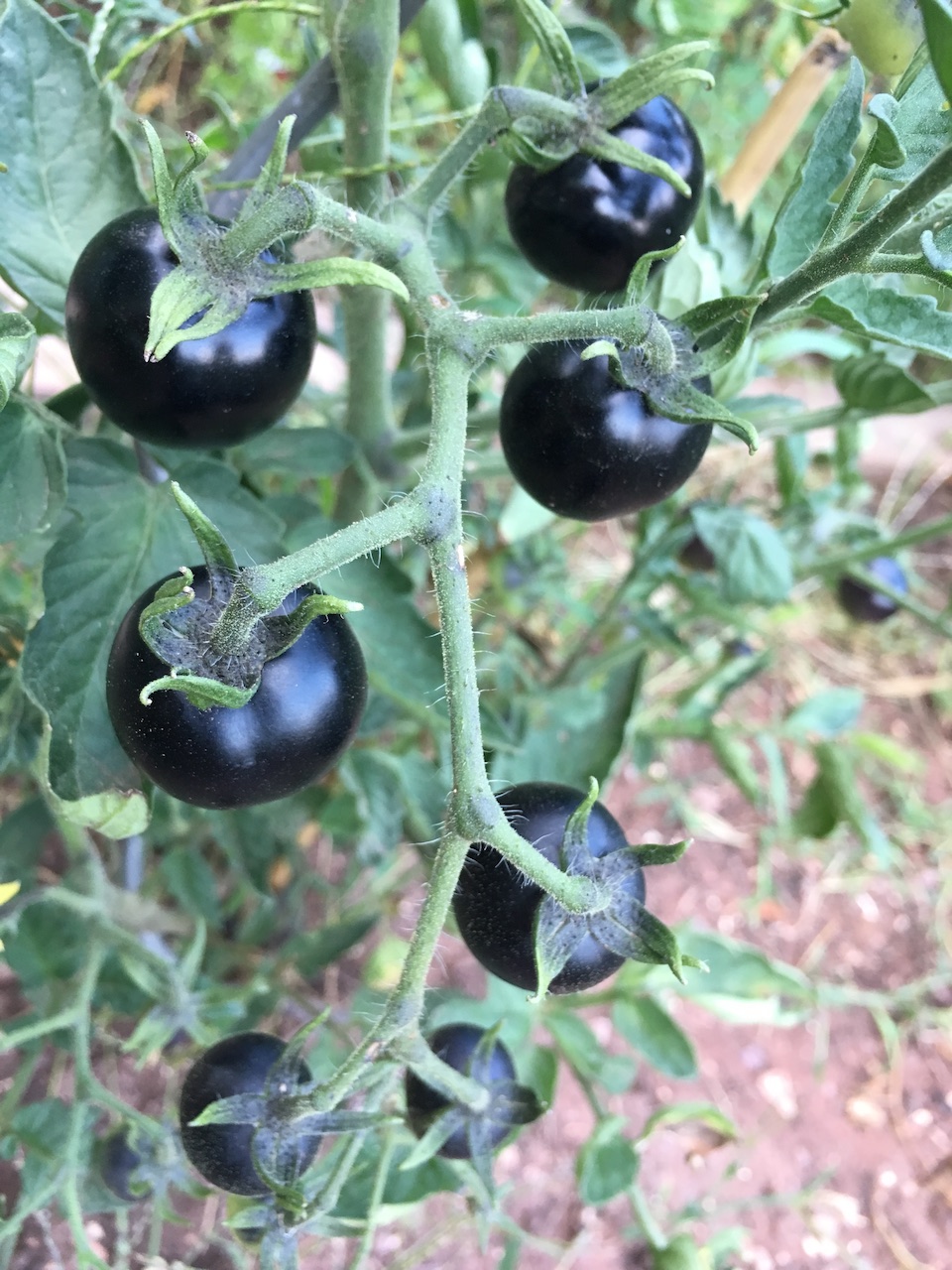 2019-08-02 Gutenberg: Hokkaidos in orange und grün, Tomaten in schwarz, rot, gold – uffbasse, das ist reiner Zufall! Die schwarzen „Indigo Rose“ haben noch eine grüne Spitze und wollen sich noch nicht so recht von ihrer Pflanze trennen, die erste kleine Johannisbeer-Tomate hat ganz gut geschmeckt, die „Golden Nuggets“ schon des öfteren. Und Chili „Big Jim“ zeigt auch so langsam, dass der Name Programm ist. 😉