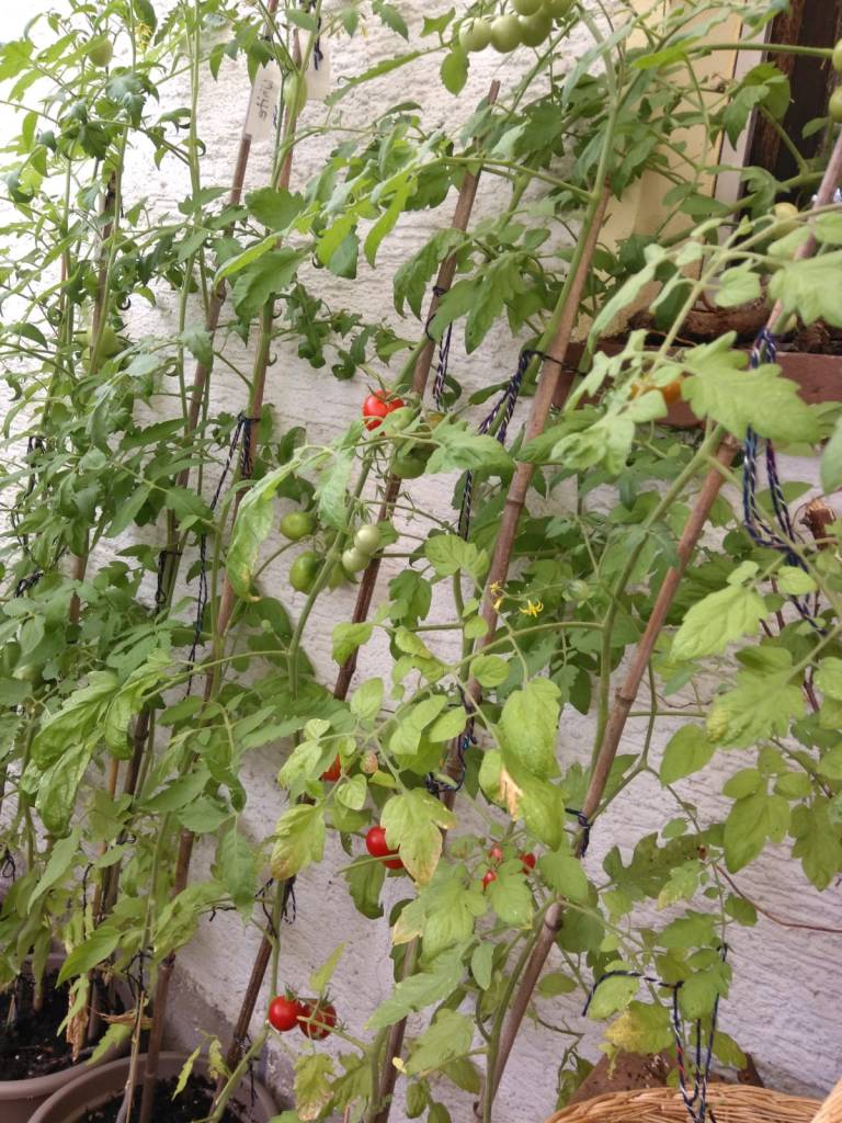Heikes Tomaten haben das Auspflanzen mit braunen Blättern gedankt, aber es kommt grün nach. Die Chilis haben sich gut entwickelt.