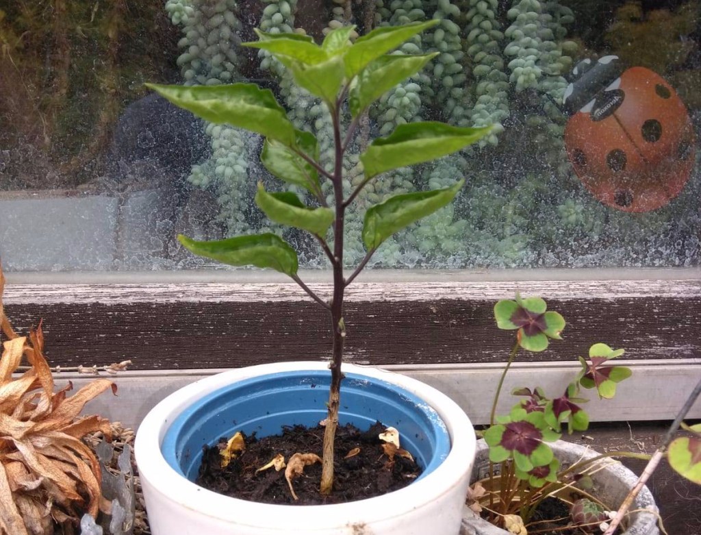 2019-05-25 Langstadt: Bis auf eine Chili sind nun alle Zöglinge verteilt, und – oh Wunder – im doch sehr armseelig anmutenden Rest in der Langstädter ArtenReich-Baumschule, hat sich heute morgen am winzigen Grünen Hokkaido namens „Geknickter Stengel“ eine wundervolle Blüte entfaltet. (Lucas, Deine nachzuliefernde Chili „Orange Lantern“ ist unten links im Bild – Lieferung folgt demnächst trotzdem…)