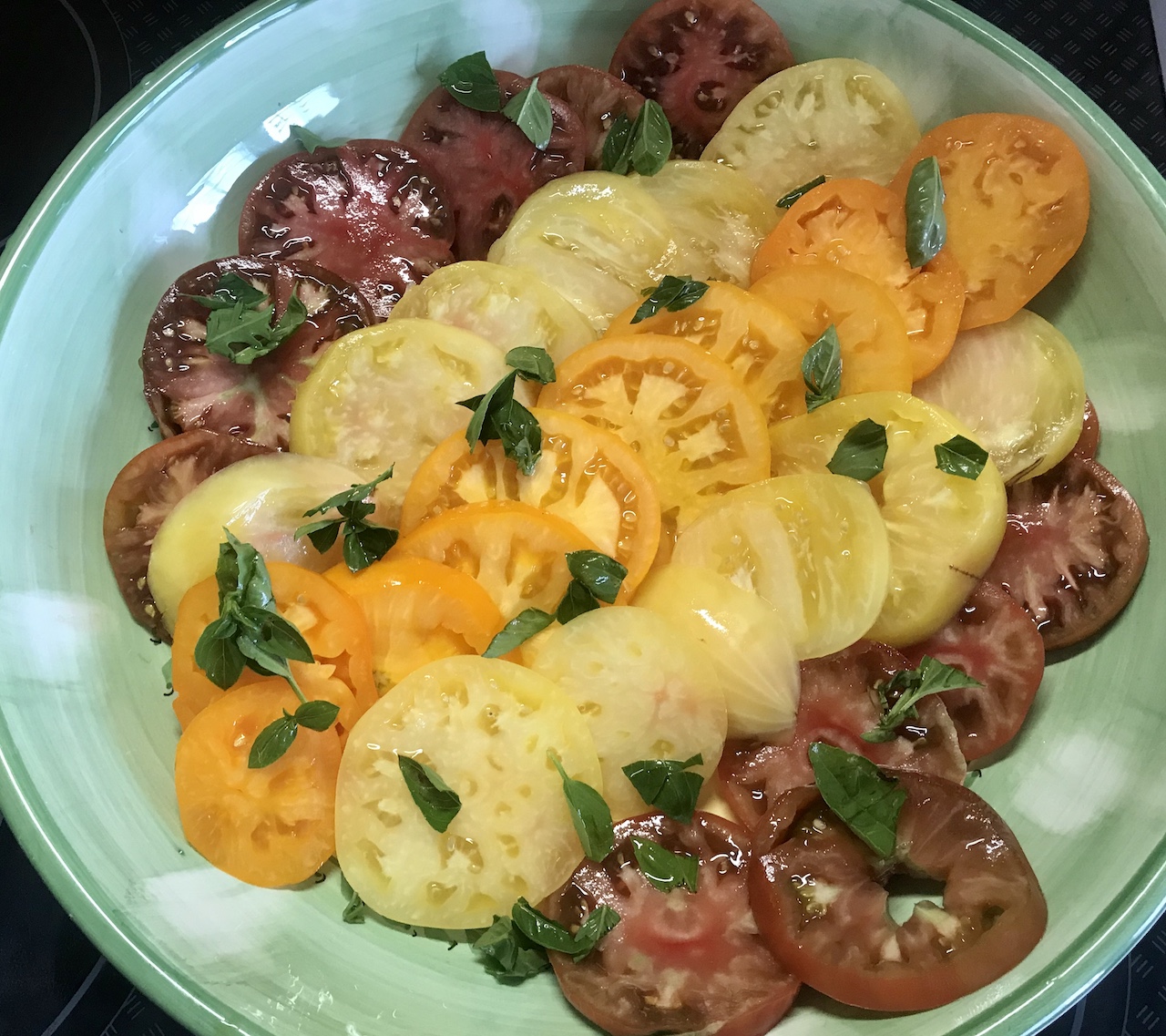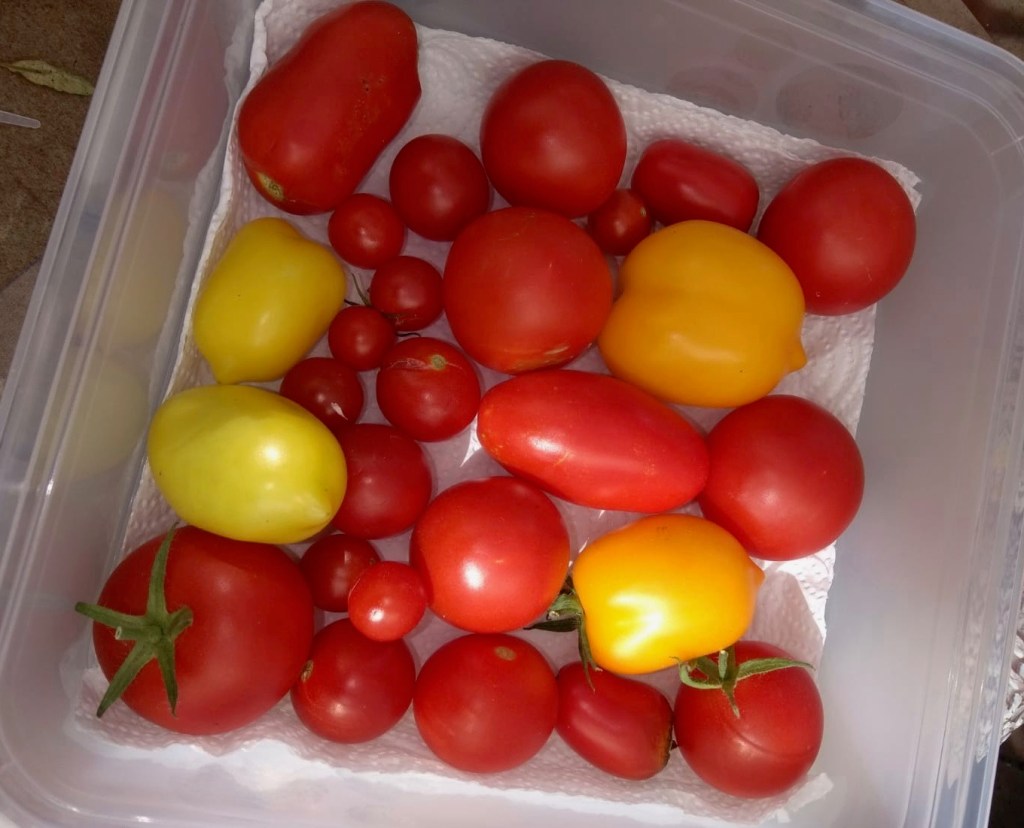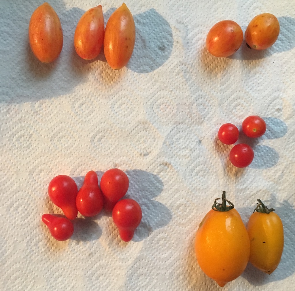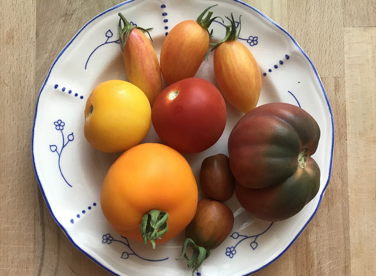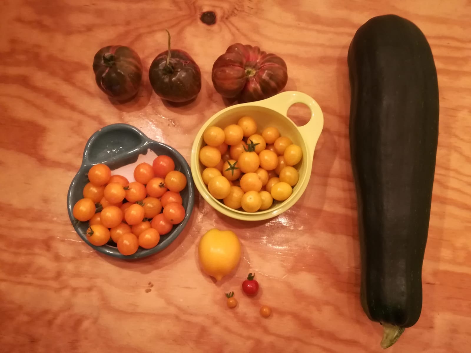 15.08.2018 Gutenberg: Eine gelbe „Rosa Eiertomate“ und Ananas-Tomaten – die eine macht ihrem Namen nicht unbedingt Ehre, schmeckt aber gut, die andern sehen nur gut aus… egal, Saatgut gesichert 🙂