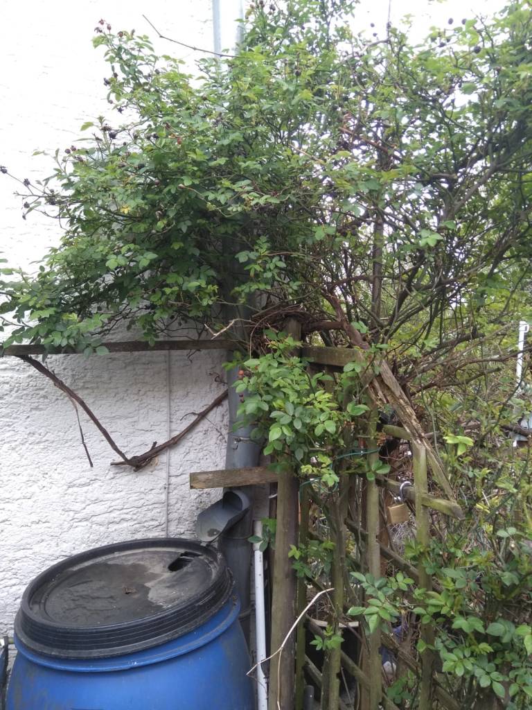 2021-05-20: Die dusselige Hausamsel im schröcklich schönen Wildnisgarten hat sich in diesem Jahr schon wieder einen Platz am Fallrohr der Regenrinne für Ihren Nistplatz ausgesucht – gleich oberhalb der Regentonne…