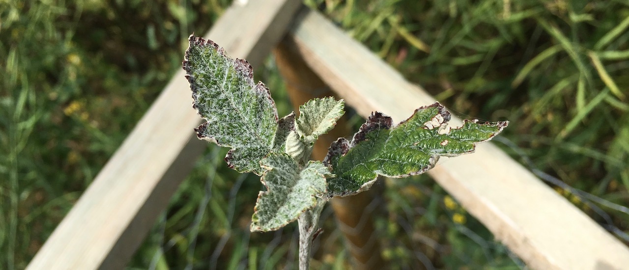 2019-06-16: Die ersten Blättchen nach der Verpflanzung zeigen sich. Gut, dass mittlerweile ein Verbissschutz angebracht ist – angeblich sind Rinde und Blätter der Elsbeere sehr beliebt bei Rehen, Hasen und Mäusen.