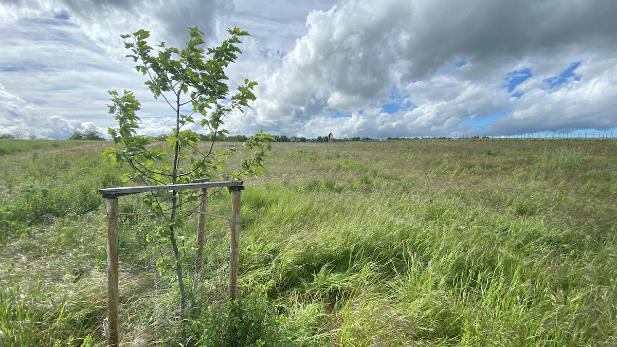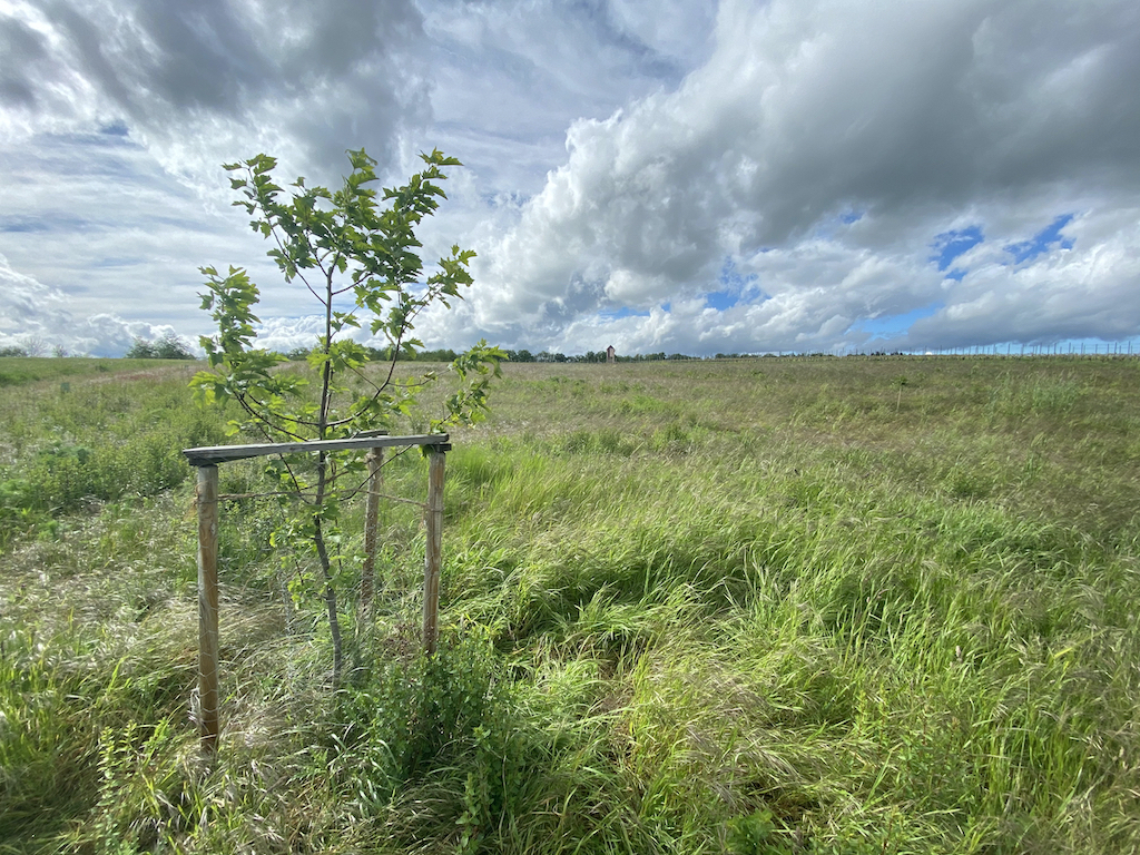 2021-05-26: Sogar als relativ trockentoleranter Baum, hat die junge Elsbeere im vergangenen Jahr nicht unbedingt immer frisch ausgesehen und war dankbar für den einen oder anderen Kanister Wasser, den sie im Vorbeifahren abbekam.