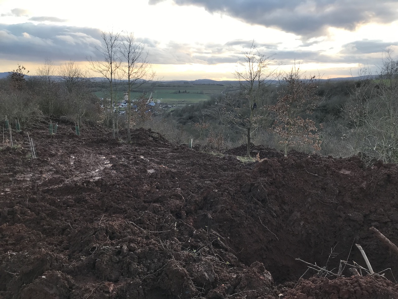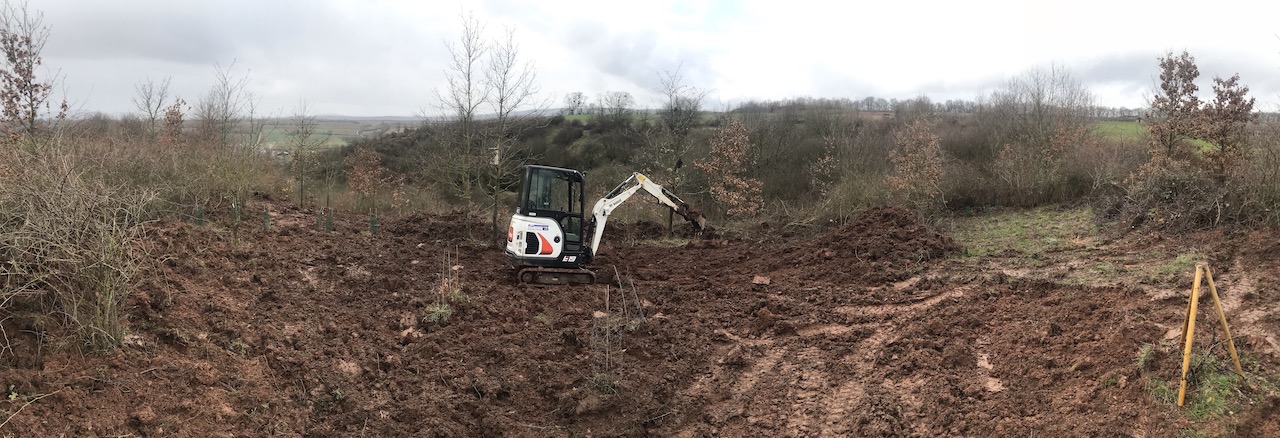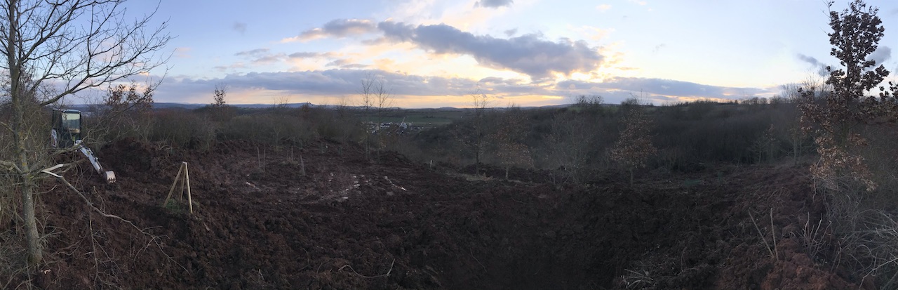 2020-02-26: Baggerwoche Tag 3: Die Hirschkäfer-Wiege ist vorbereitet – momentan kann diese übergangsweise als Wildsau-Jacuzzi genutzt werden ;-D. Der Lederhosen-Einsatz ist damit vorerst beendet und man darf gespannt sein, wie es den Wildschweinen gefällt.