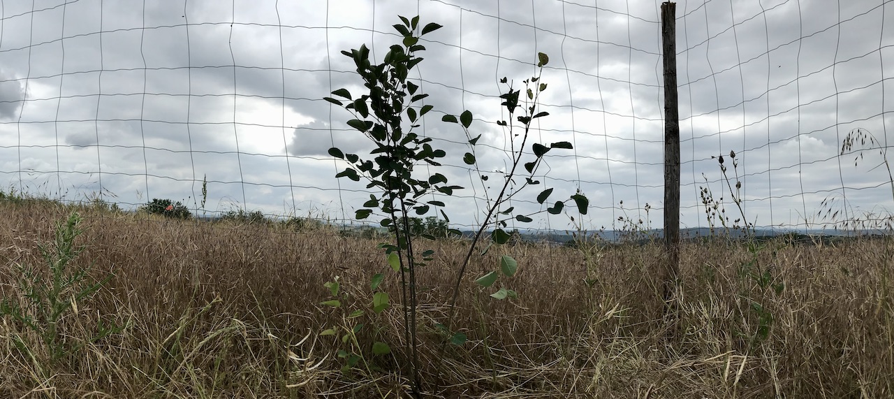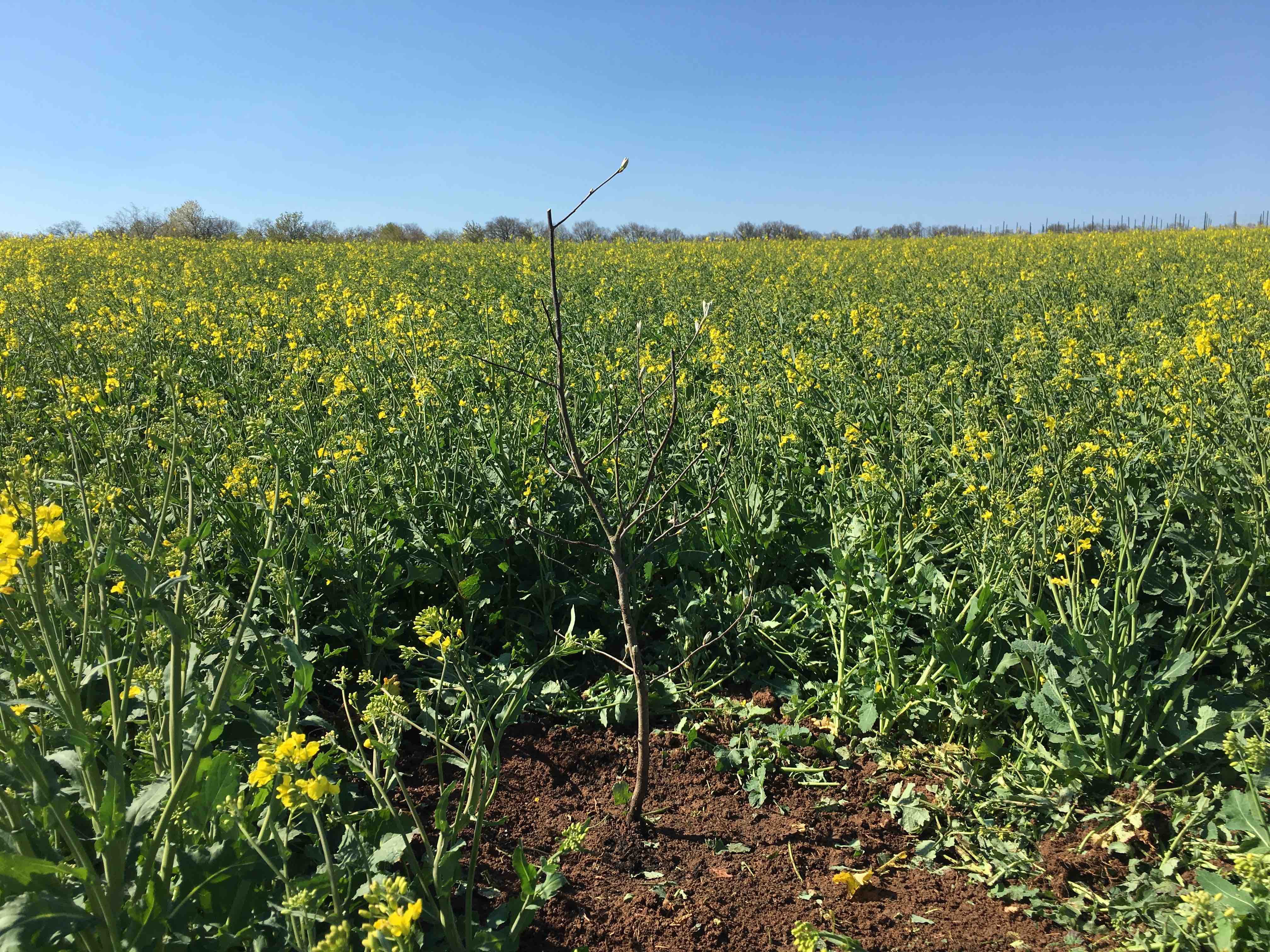 2019-04-20: In Absprache mit dem Landwirt, dürfen die ersten Bäumchen auf das Rapsfeld ziehen. Eine von Naturfreunden geschenkte Elsbeere, die sich selbst in deren Garten gepflanzt hatte und eine ebenso wildwüchsige Eberesche aus dem Projektgebiet in Langstadt.