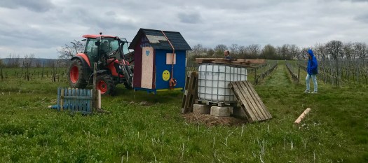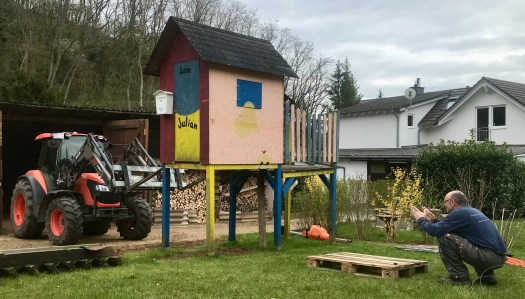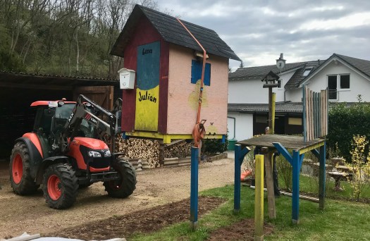 2020-04-03: Umzug der „Villa Wagner“ vom Vogelsang auf die Bienenweide. Dank schweren Geräts und tatkräftiger Mithilfe konnte das Spielhaus an seinen neuen Standort gebracht werden und kann bald damit beginnen seinen neuen Zweck zu erfüllen: Regenwasser sammeln!