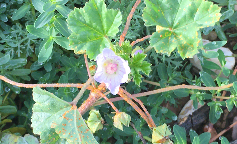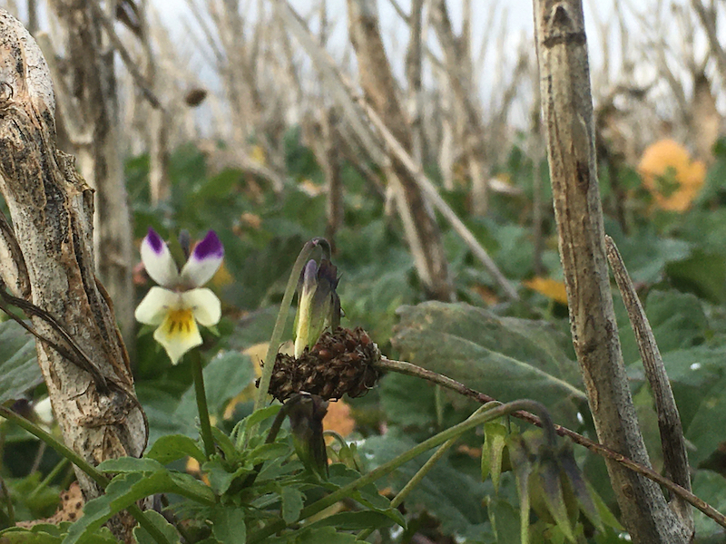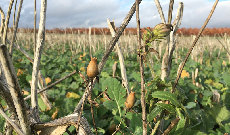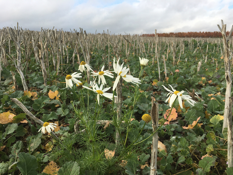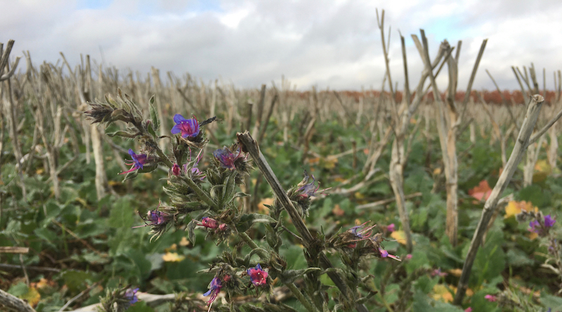 2019-11-09: Nach der Rapsernte zeigen sich schon die ersten Neubürger: Kamille, Natterkopf, Wiesennelke und andere Wildblumen erobern sich das Feld zurück.