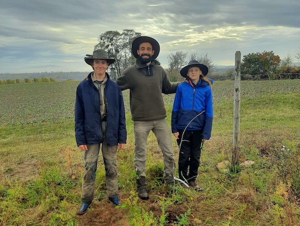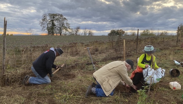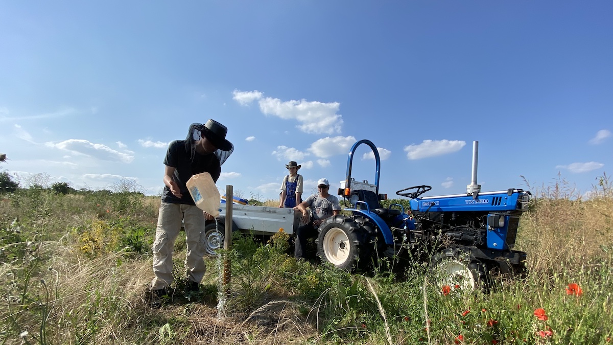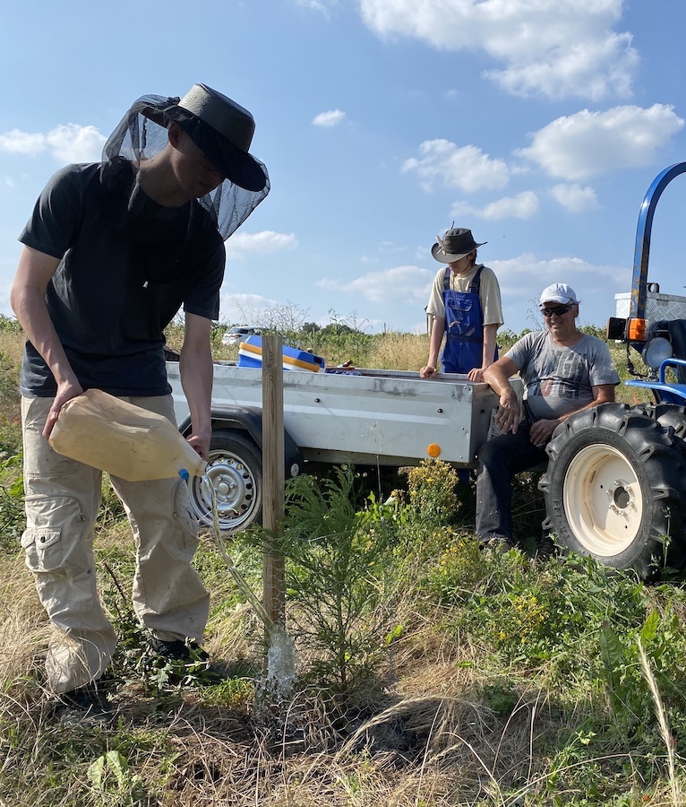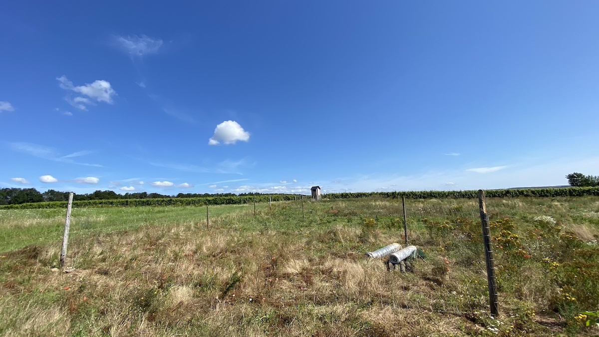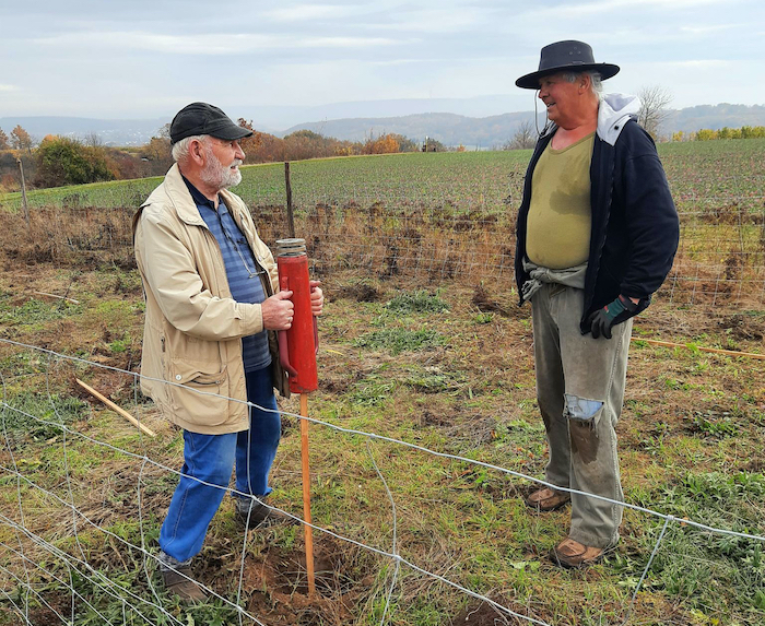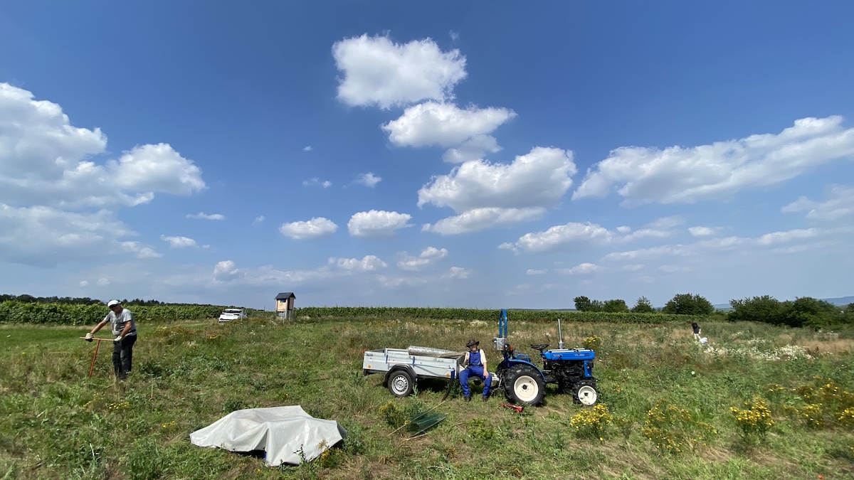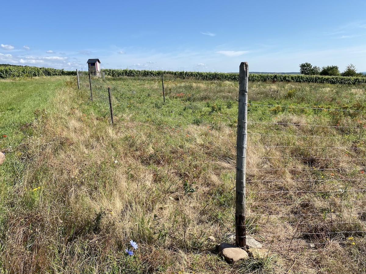 2021-07-23: Zur Vorbereitung auf die Pflanzparty am 31. Oktober wurden ein paar Pfähle in den steinigen Boden gerammt, etwas Zaun gespannt und einige Pflanzflächen mit der Sense bearbeitet.