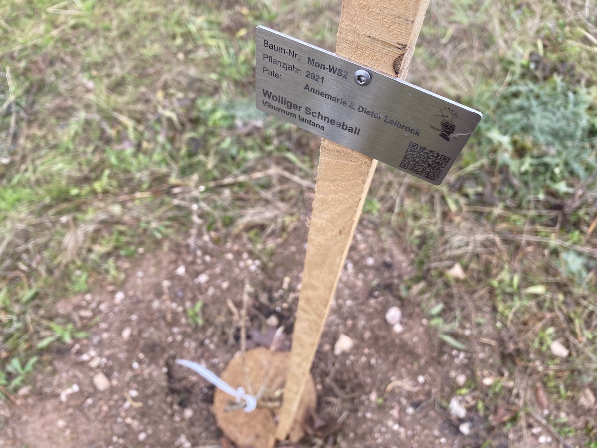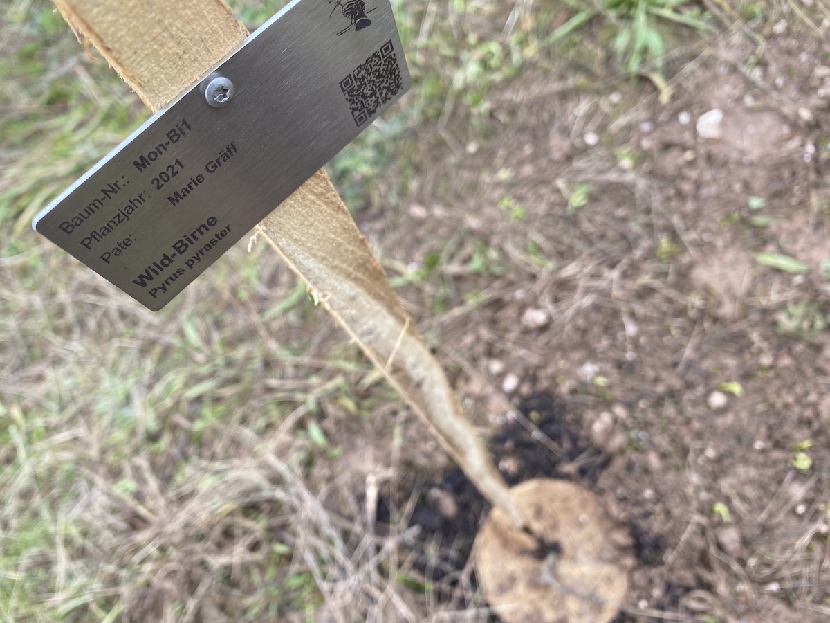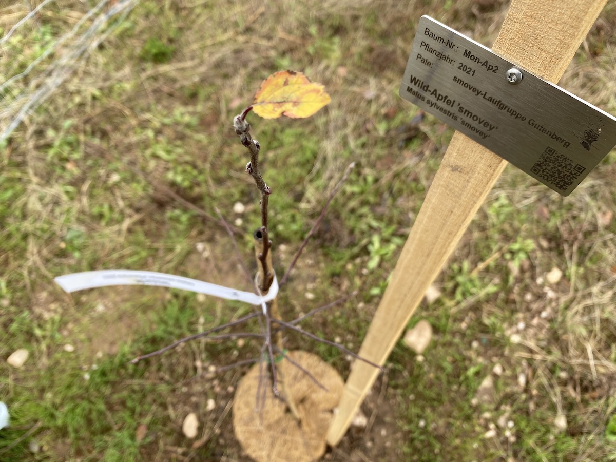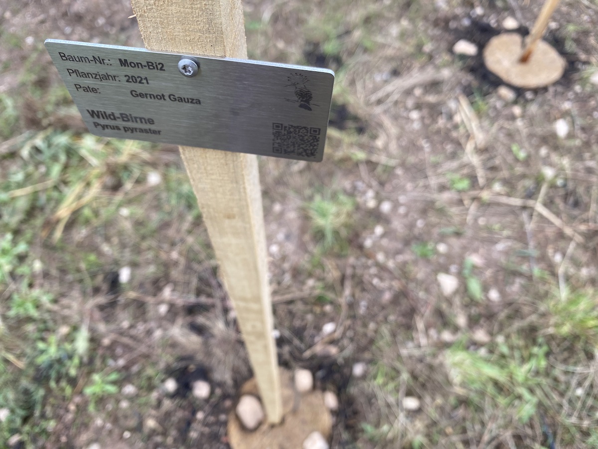 2021-12-03: Sollte sich einer der Monau-Baumpaten trotz des widrigen Wetters auf die Bienenweide verirren, so ist nun ein Auffinden des bei der Pflanzparty gepflanzten Patenbaums etwas leichter möglich.
