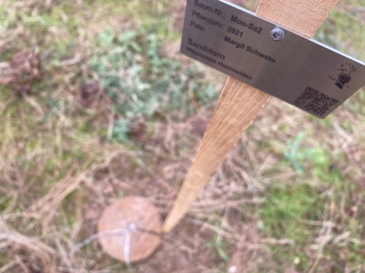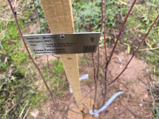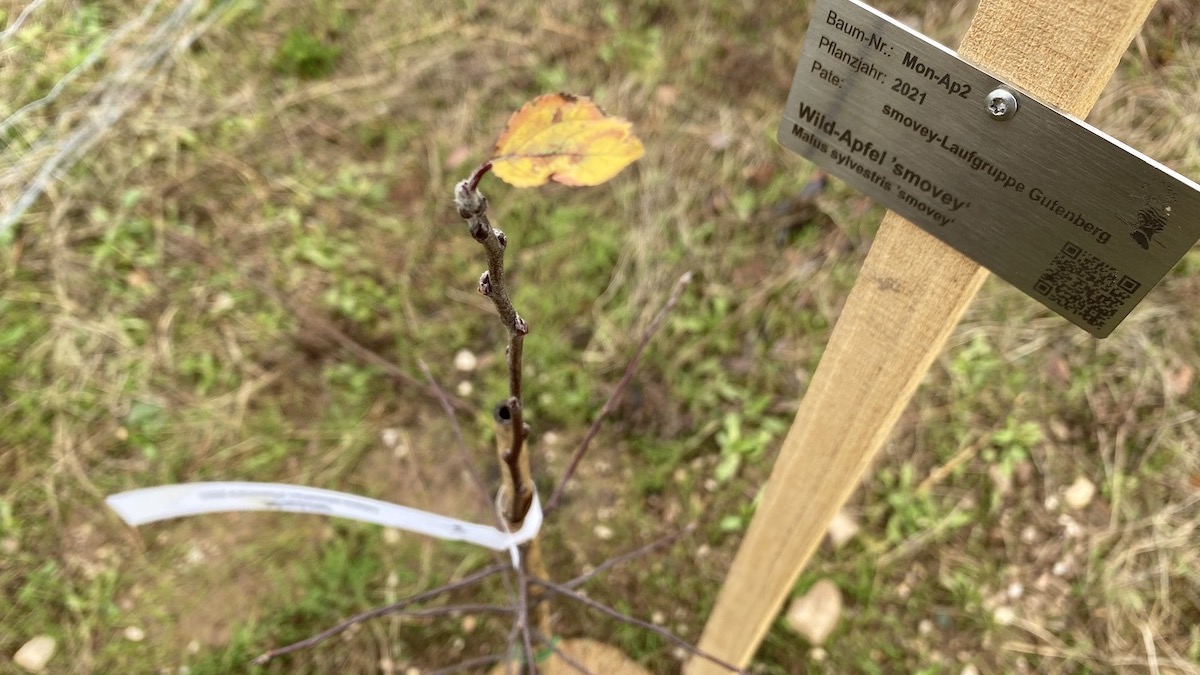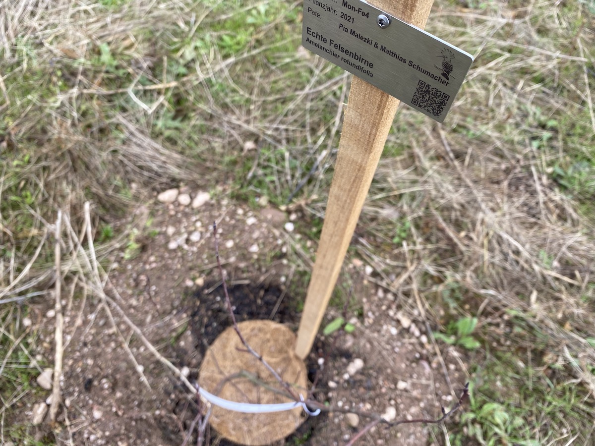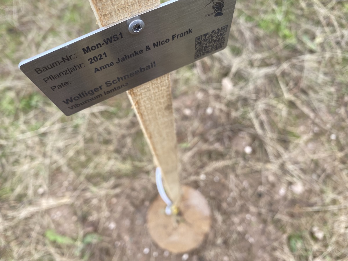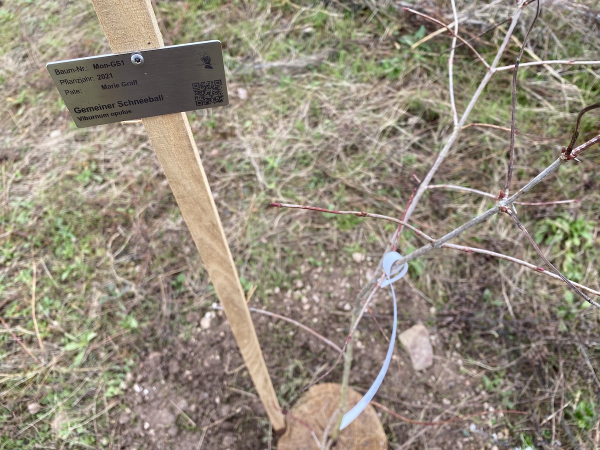 2021-12-03: Sollte sich einer der Monau-Baumpaten trotz des widrigen Wetters auf die Bienenweide verirren, so ist nun ein Auffinden des bei der Pflanzparty gepflanzten Patenbaums etwas leichter möglich.