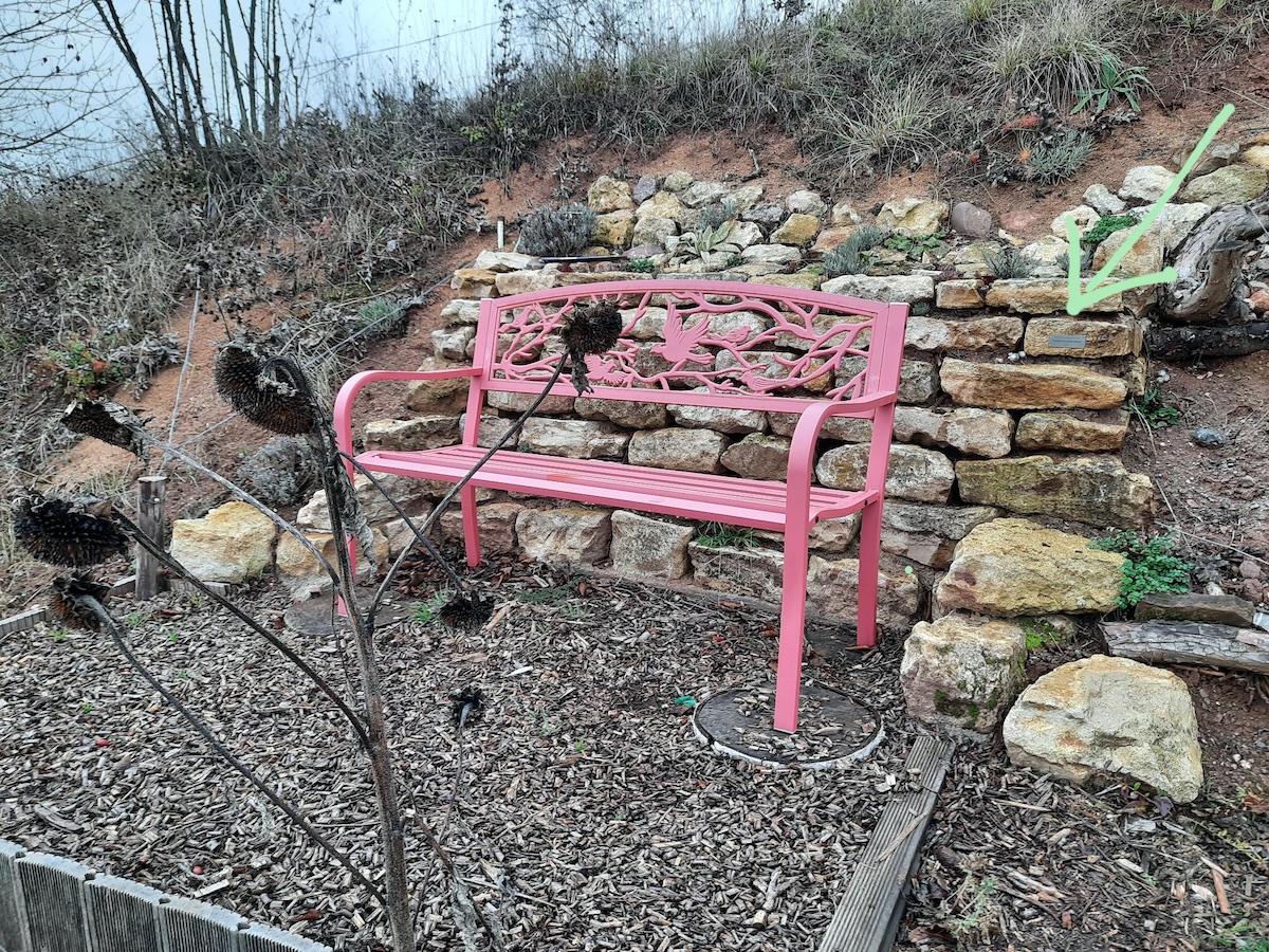 2021-11-28: Damit erkennbar wird, wer die edlen Spender dieser bemerkenswerten Sitzgelegenheit sind – und in diesem Fall auch die fleißigen Gestalter der ganzen umgebenden Anlage – ziert nun ein Edelstahlschildchen die Trockenmauer am Bankplatz im Burgblick der Obstterrassen.