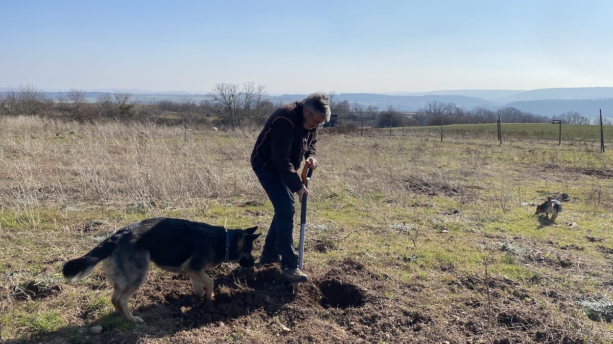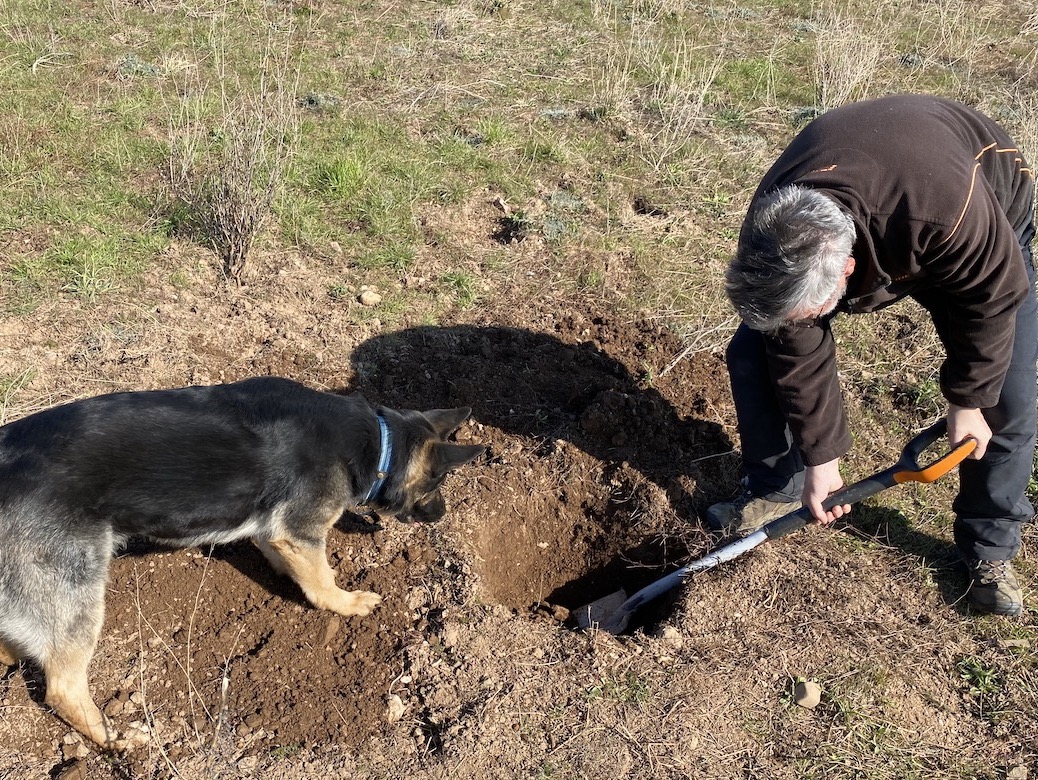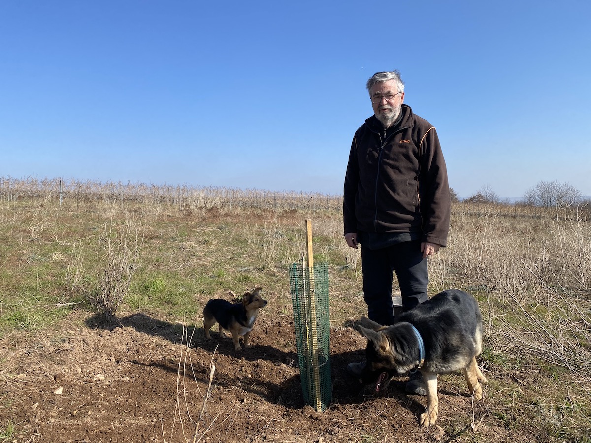 2022-03-05: Erster Pflanzakt der beiden Freunde aus Windesheim. Gepflanzt wird zunächst ein Stein-Mandelbaum, gezogen aus einer Mandel aus dem Örtchen namens Mandel.