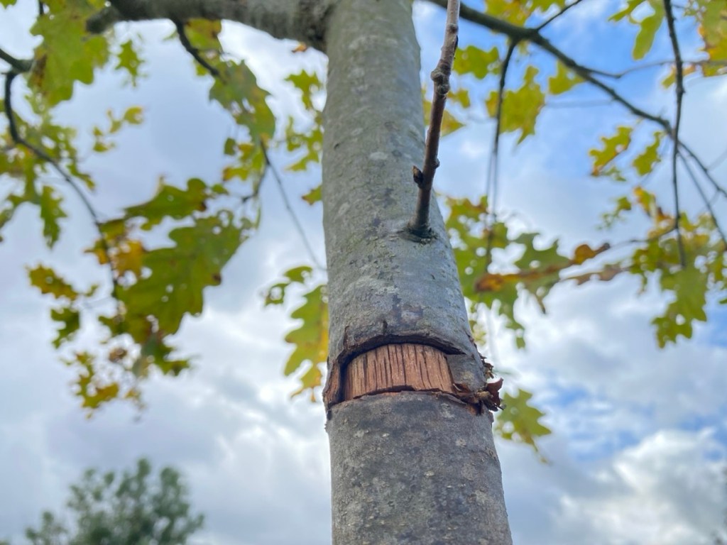 2025-10-05: Auch bei den drei Volksbank-Eichen wurde eine nur halb durchschnitten und hat bislang sogar den Stürmen standgehalten. Die anderen beiden weniger Standhaften, haben aber schon wieder kräftig ausgetrieben.