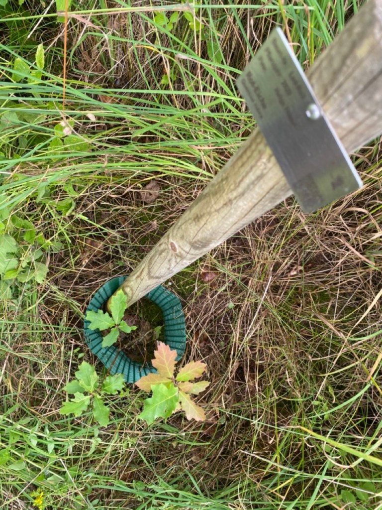 Und so wurde der dürre Stengel heute zusammengefaltet und der etwas kleineren, aber den Sommer gut überstandenen Eiche aus eigener Anzucht als Nahrung mit ins Pflanzloch gegeben. Mögen ihre sterblichen Überreste vom kleinen Verwandten aufgenommen und in eine grüne – und im Herbst „rote“ – Zukunft getragen werden.