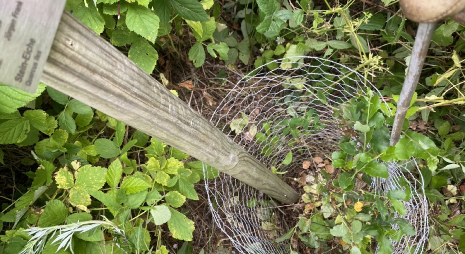 2020-11-01: Die erste immergrüne Eiche hat ihren Platz in der Hirschkäfer-Lederhose gefunden. Ortsbürgermeister Jürgen Frank ergriff den Spaten, übernahm die Patenschaft und war sichtlich erfreut einen Beitrag für das Naturschutz-Projekt am Gutenburg-Wanderweg zu leisten.