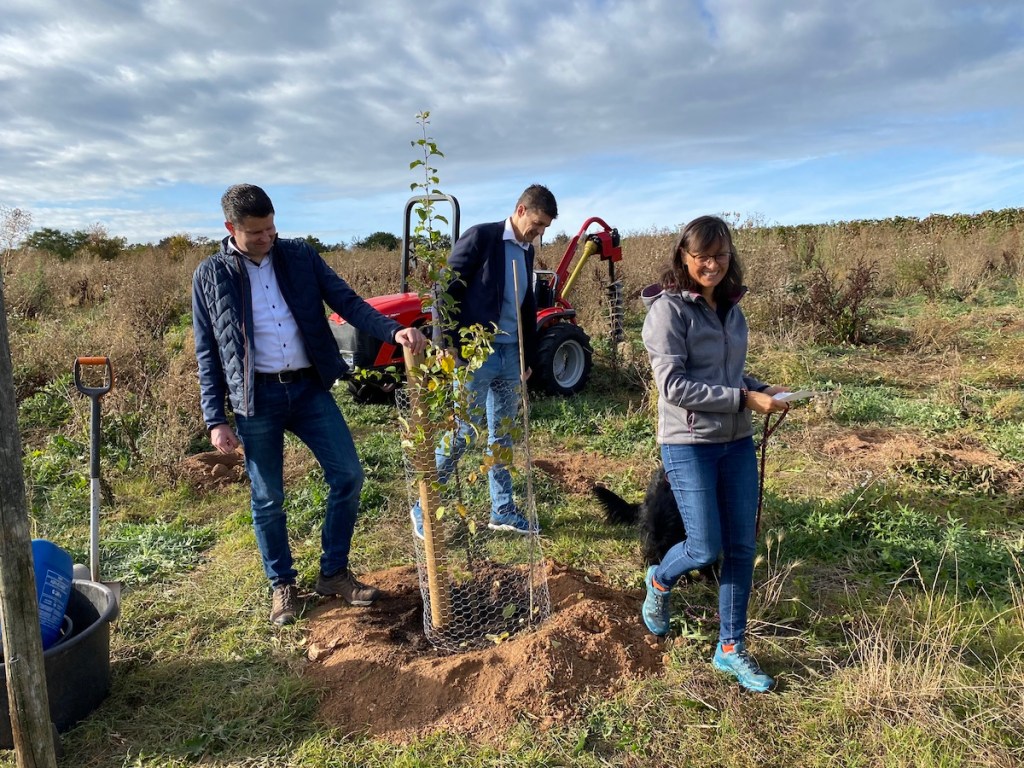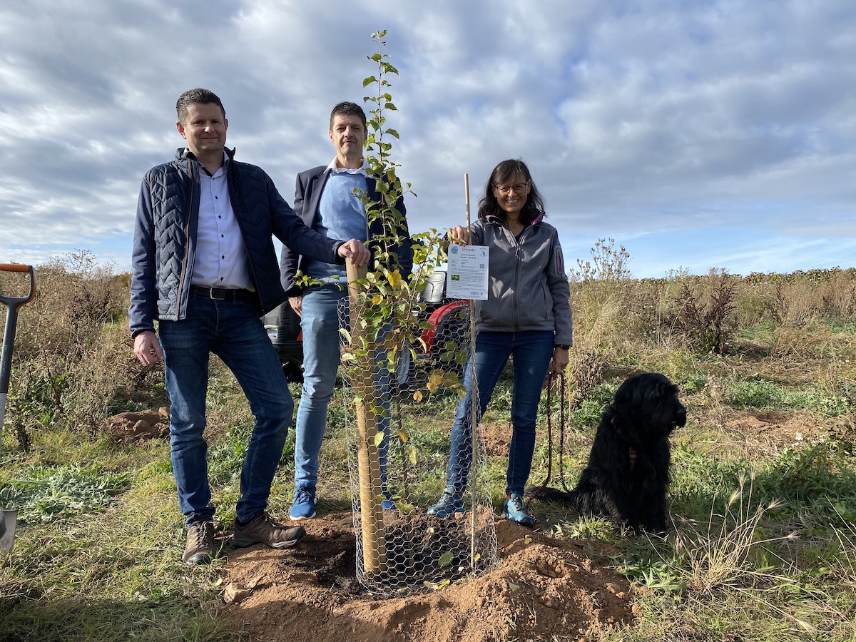 2021-10-14: Wenn Engel reisen, dann macht der Himmel auch mal die Schleusen dicht und lässt die Sonne scheinen. Es scheint so, als würden gute Taten umgehend vom Wettergott belohnt und so konnte die örtliche Volksbank (in diesen regenreichen Tagen) trockenen Fußes den ersten Wild-Apfelbaum auf der Bienenweide Monau pflanzen.