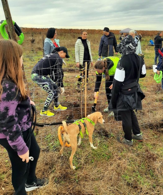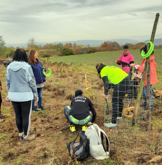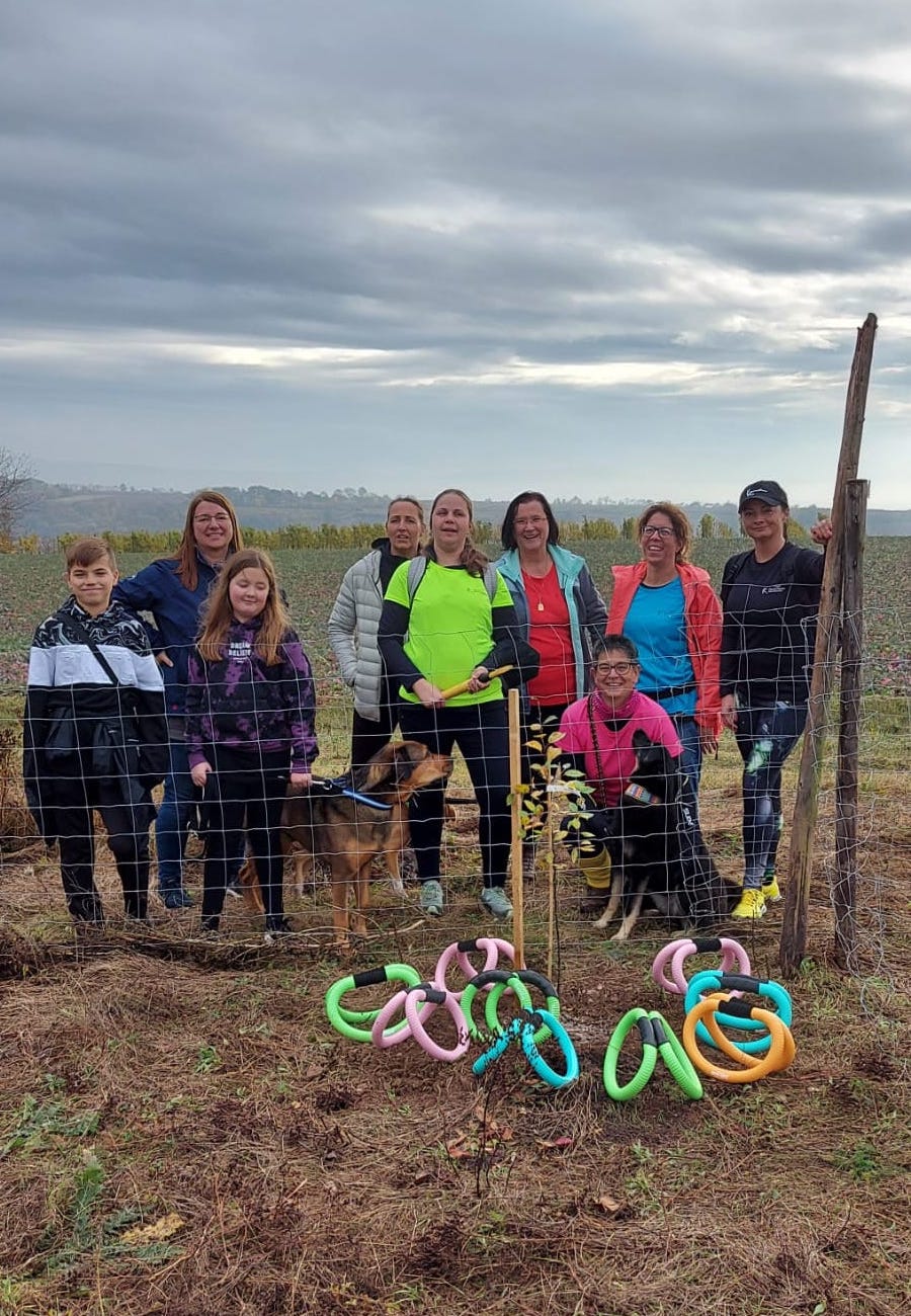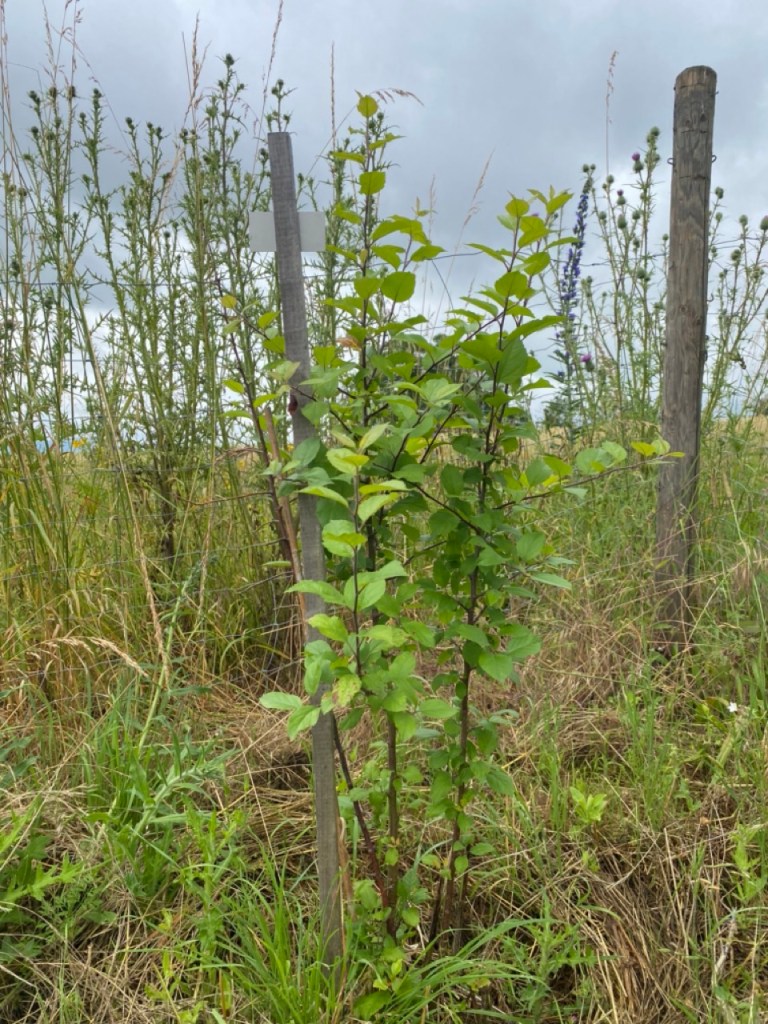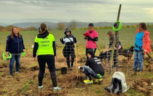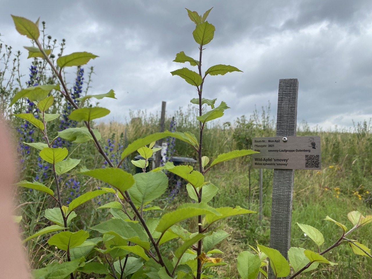 2021-10-31: Schon vorab wurde ein Wild-Apfel reserviert und bei der Pflanzparty von der Gutenberger Laufgruppe zum smovey-Baum getauft, mit vereinten Kräften in die Erde gebracht und anständig begossen.