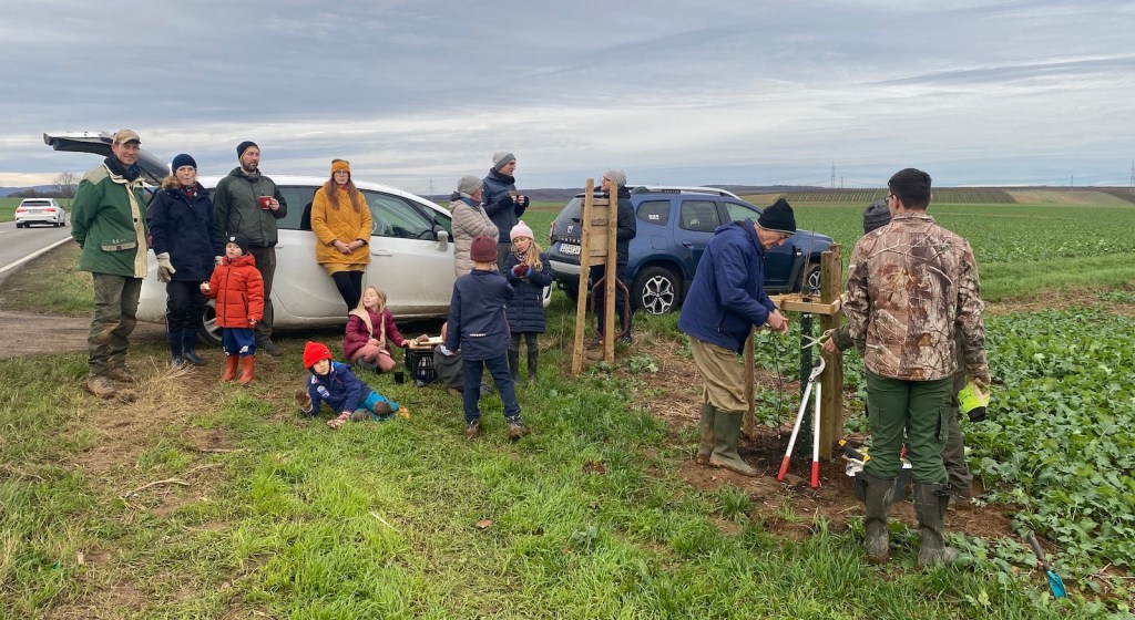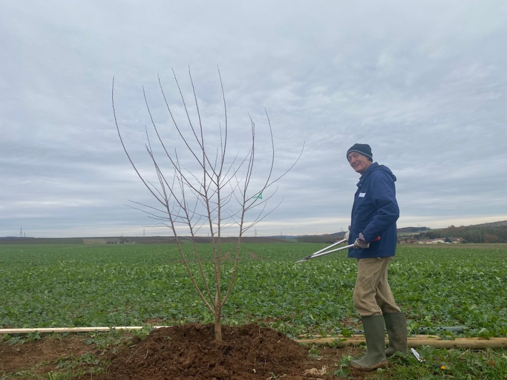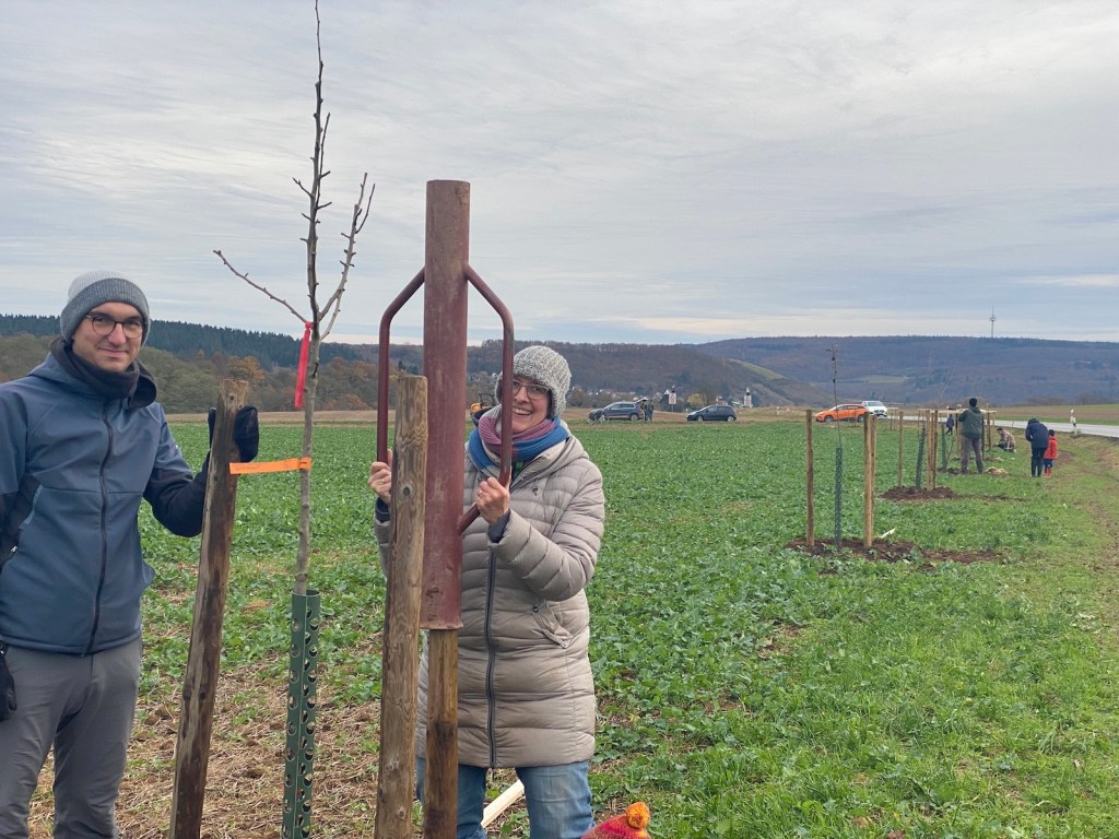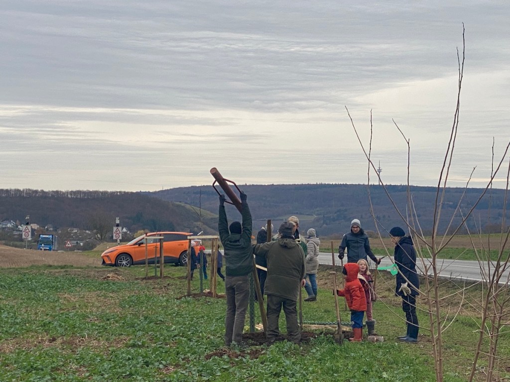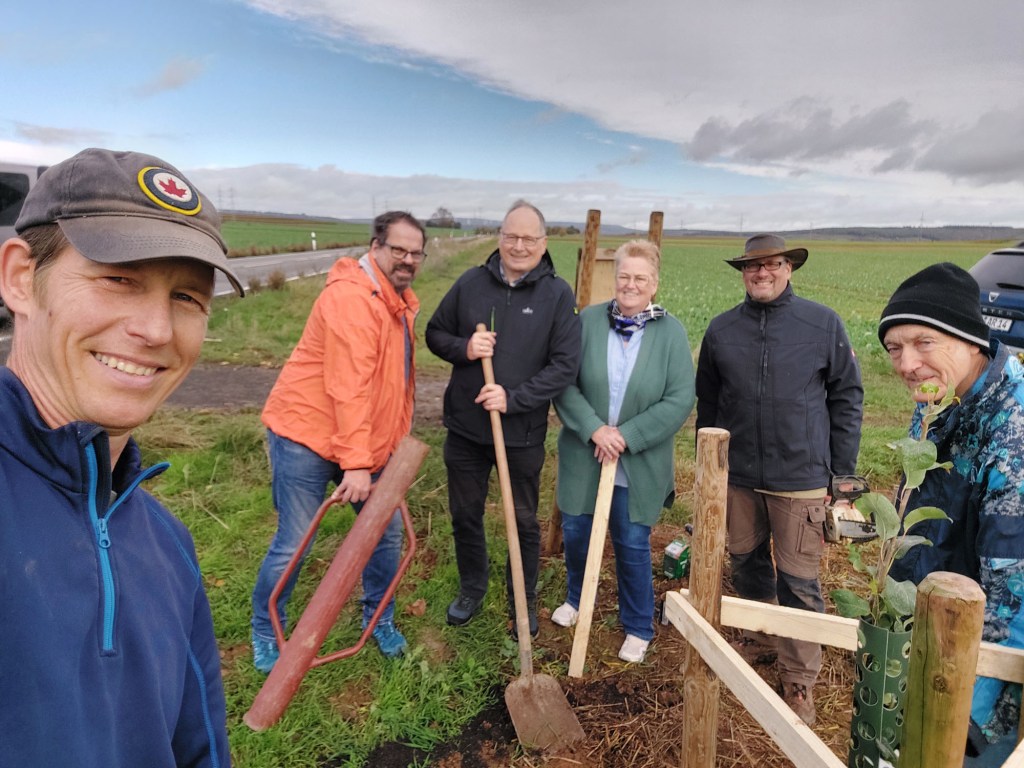 2024-11-23: Der große Tag ist gekommen! Dank guter Vorbereitung von Gernot und seinen kleinen Baggergehilfen, konnten die 12 Bäumchen in Windeseile gepflanzt werden.