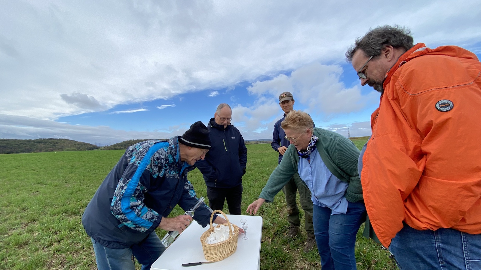 2024-10-19: Der erste Birnbaum ist gepflanzt: Ein Nußlocher Kotäckerle. Diese Mostbirne ist eine seltene Schnapsbirne von besonderer Qualität, wovon sich die Teilnehmer der Auftaktpflanzung auch unmittelbar überzeugen konnten – vielen Dank an dieser Stelle nochmals an unseren Pomologen Hans Faus vom BUND Guldental, der Baum und Brand mitbrachte.