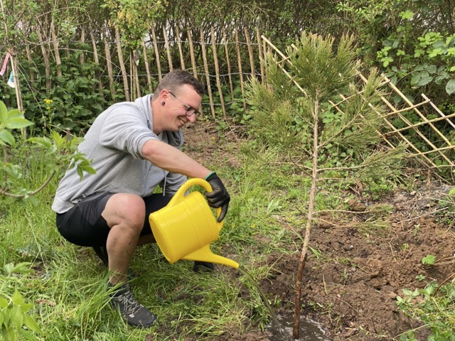 2025-04-20: Nach Monaten – oder waren es Jahre? – des Ausharrens in der Baumschule, konnte das Mammutbaum-Geburtstagsgeschenk am Ostersonntag endlich in die Erde verpflanzt werden.