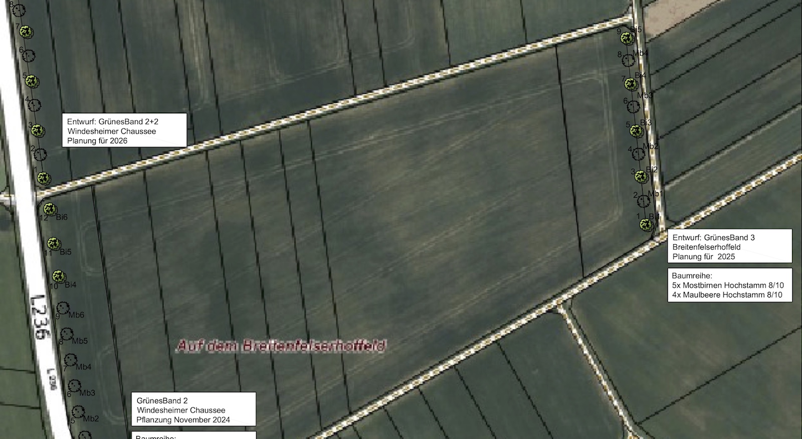 Mittlerweile haben wir eine stolze Zahl von 16 Baumpaten erreicht (plus evtl. 4 weitere). Der große Anklang freut uns Initiatoren des GrünenBandes besonders. Mit dieser Anzahl können wir das „GrüneBand3“ mit 9 Bäumen voll bepflanzen und bereits das „GrüneBand4“ (war geplant für 2026) an der „Windesheimer Chaussee“ zur Hälfte bepflanzen.