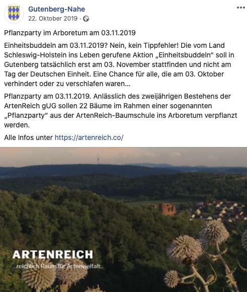 Pflanzparty am 03.11.2019. Anlässlich des zweijährigen Bestehens der ArtenReich gUG sollen 22 Bäume im Rahmen einer sogenannten „Pflanzparty“ aus der ArtenReich-Baumschule ins Arboretum verpflanzt werden.“