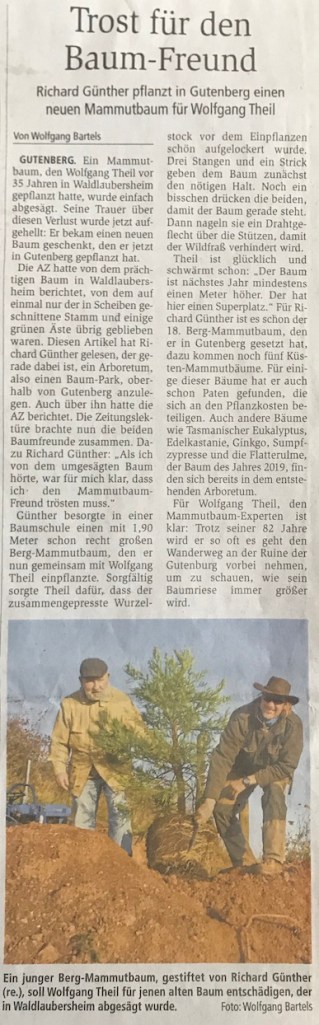 „Richard Günther setzt für Wolfgang Theil einen neuen Mammutbaum ein, weil dessen Exemplar einfach abgesägt wurde.“