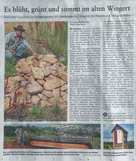 „Das Interesse an der Natur durch eine „erfahrbare Vielfältigkeit“ zu wecken, hat sich Richard Günther (49) auf seine Fahnen geschrieben und dafür in Gutenberg, genauer gesagt, oberhalb der Gemeinde „Im Vogelgesang“ die idealen Voraussetzungen gefunden.“