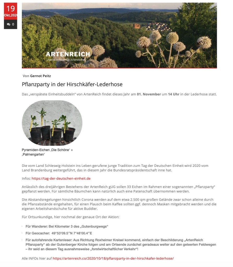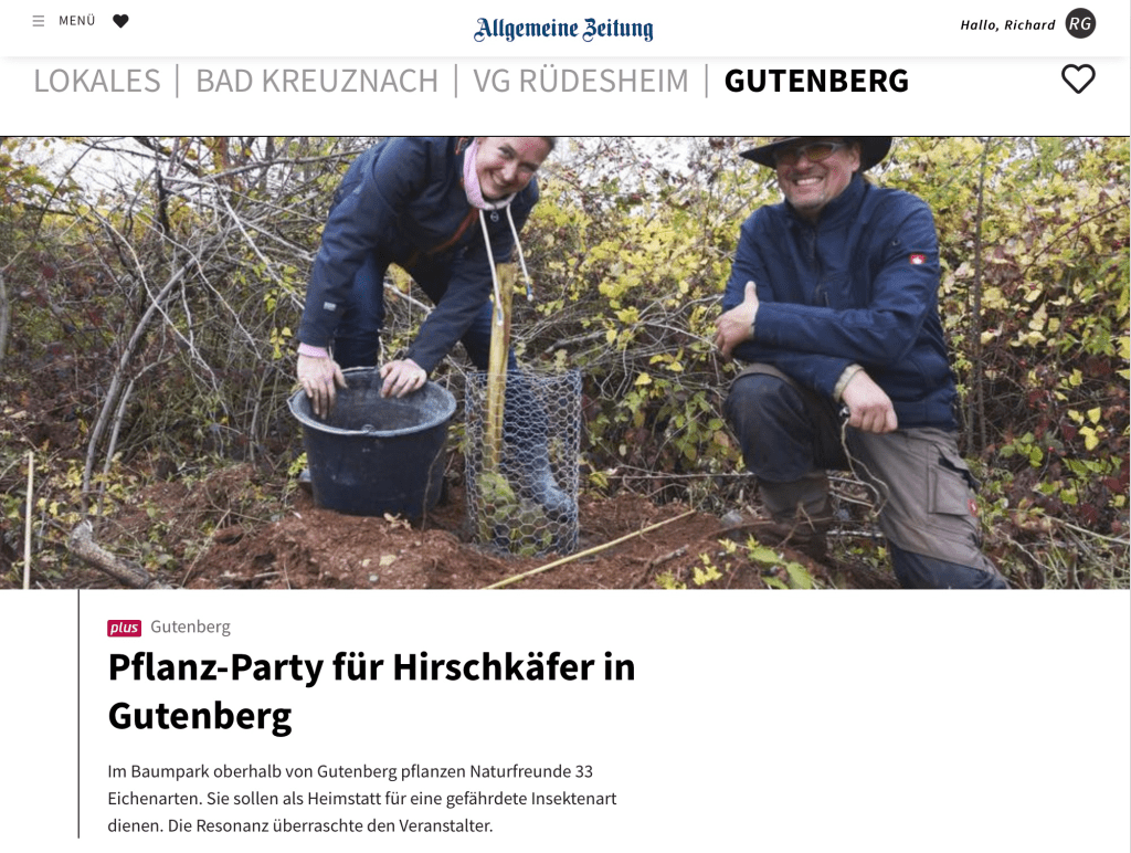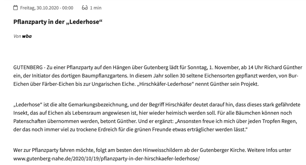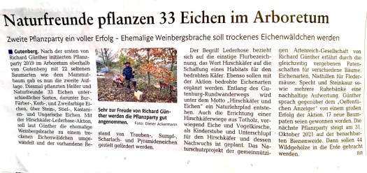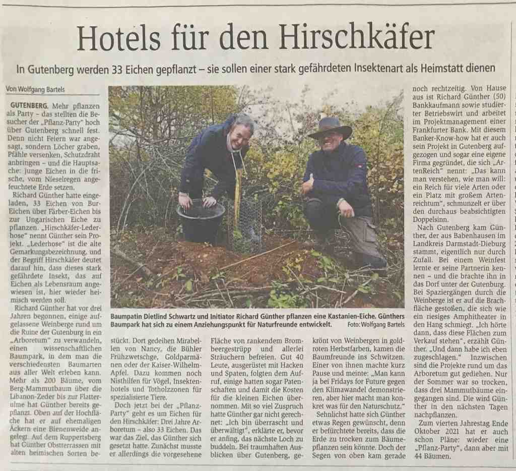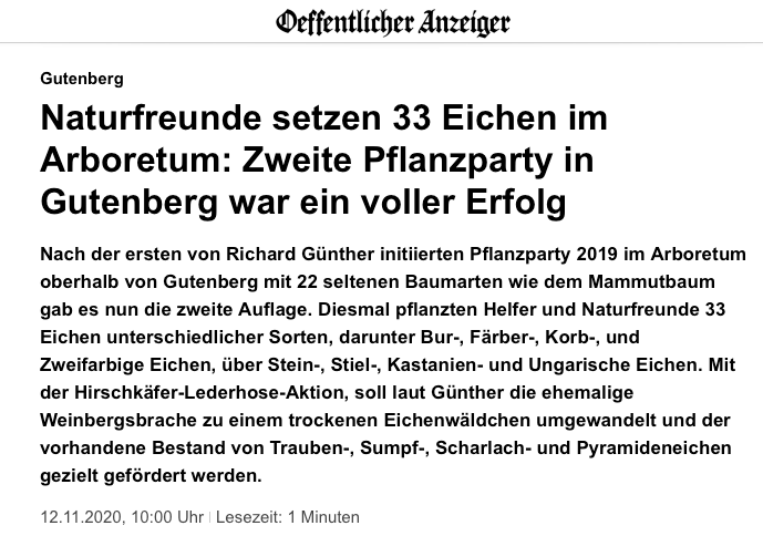 „Nach der ersten von Richard Günther initiierten Pflanzparty 2019 im Arboretum oberhalb von Gutenberg mit 22 seltenen Baumarten wie dem Mammutbaum gab es nun die zweite Auflage. Diesmal pflanzten Helfer und Naturfreunde 33 Eichen unterschiedlicher Sorten, darunter Bur-, Färber-, Korb-, und Zweifarbige Eichen, über Stein-, Stiel-, Kastanien- und Ungarische Eichen. Mit der Hirschkäfer-Lederhose-Aktion, soll laut Günther die ehemalige Weinbergsbrache zu einem trockenen Eichenwäldchen umgewandelt und der vorhandene Bestand von Trauben-, Sumpf-, Scharlach- und Pyramideneichen gezielt gefördert werden.“