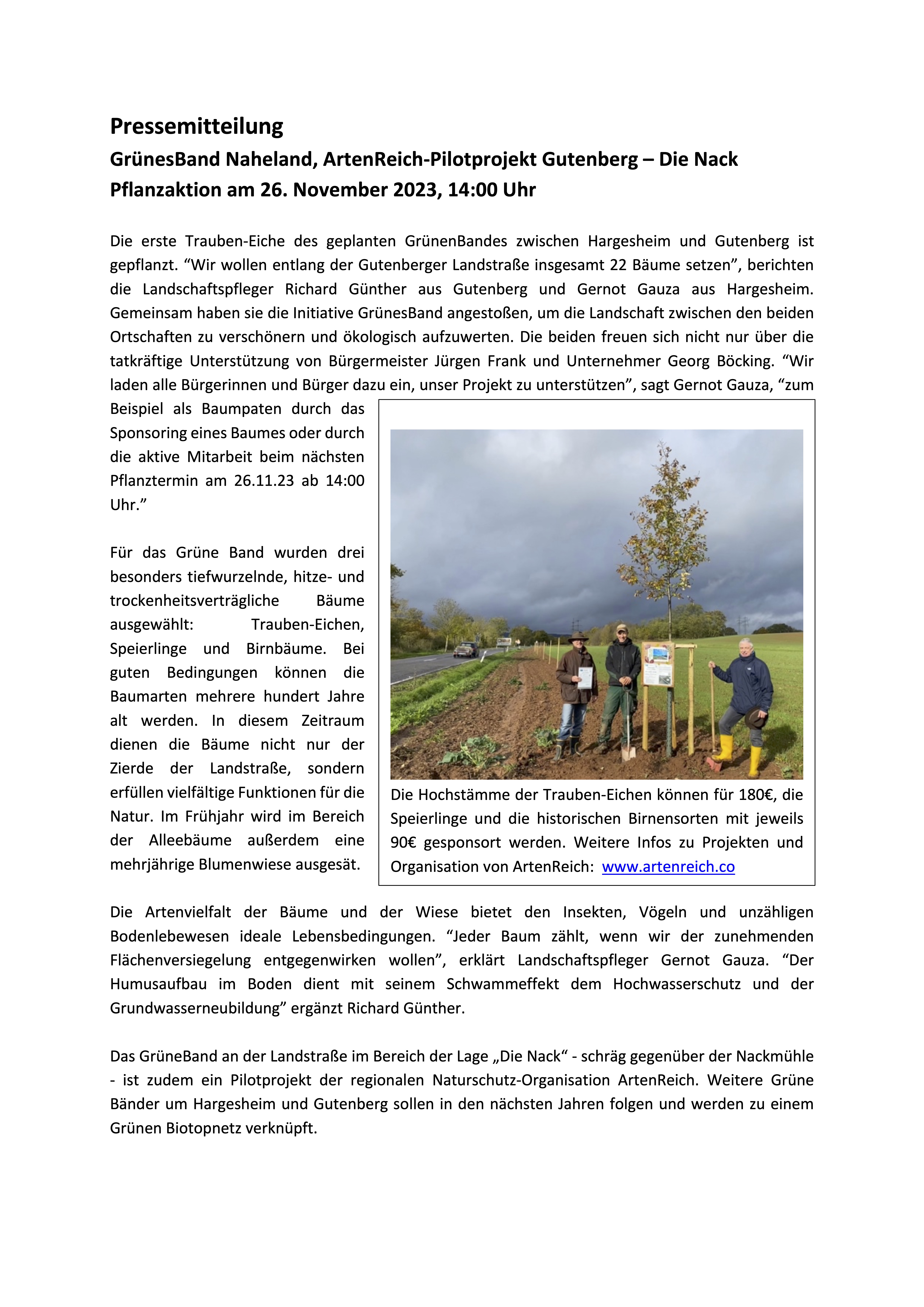 Die erste Trauben-Eiche des geplanten GrünenBandes zwischen Hargesheim und Gutenberg ist gepflanzt. “Wir wollen entlang der Gutenberger Landstraße insgesamt 22 Bäume setzen”, berichten die Landschaftspfleger Richard Günther aus Gutenberg und Gernot Gauza aus Hargesheim. Gemeinsam haben sie die Initiative GrünesBand angestoßen, um die Landschaft zwischen den beiden Ortschaften zu verschönern und ökologisch aufzuwerten. Die beiden freuen sich nicht nur über die tatkräftige Unterstützung von Bürgermeister Jürgen Frank und Unternehmer Georg Böcking. “Wir laden alle Bürgerinnen und Bürger dazu ein, unser Projekt zu unterstützen”, sagt Gernot Gauza, “zum Beispiel als Baumpaten durch das