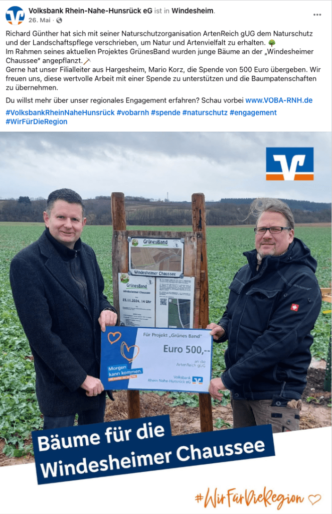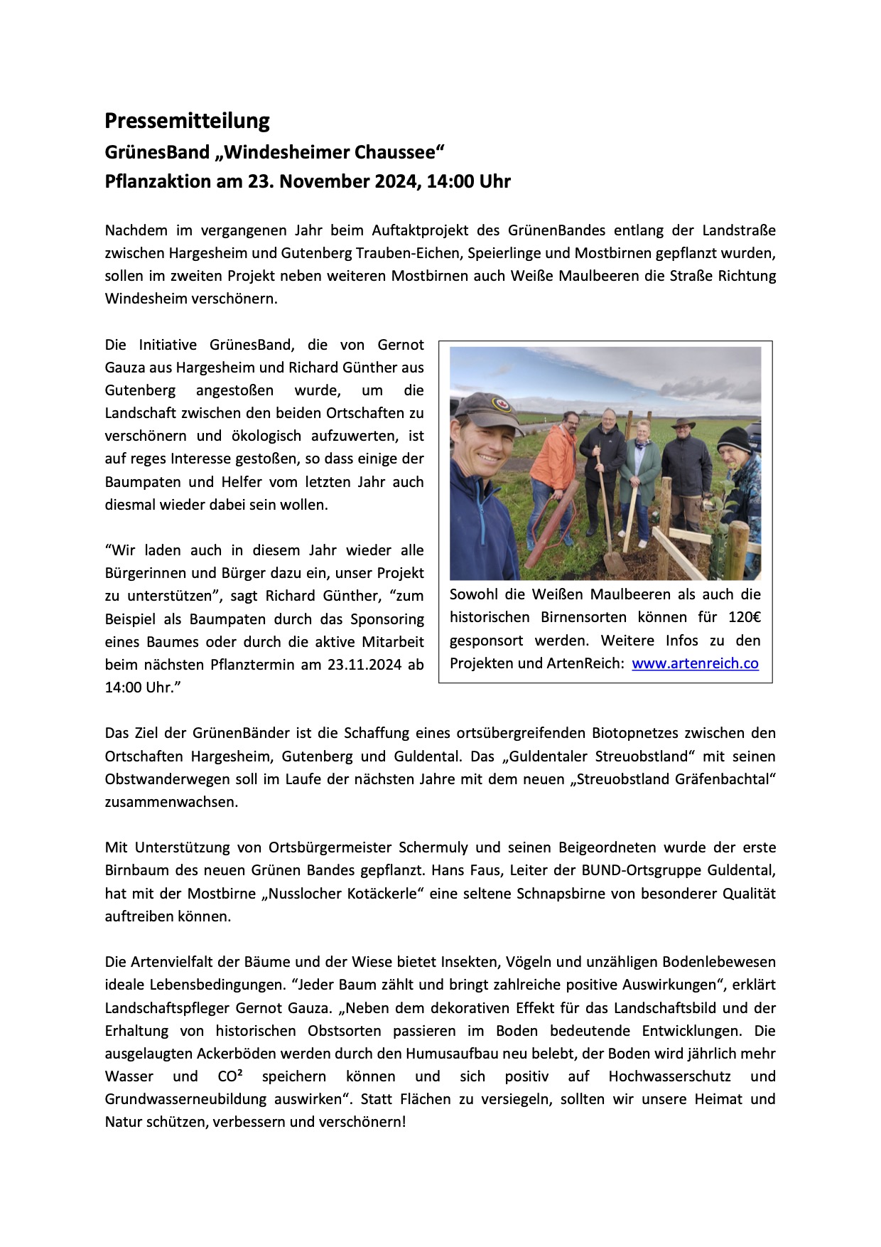 Die gemeinnützige Gesellschaft ArtenReich bietet mit der Initiative GrünesBand jedem Bürger die Möglichkeit sich aktiv in den Naturschutz der eigenen Heimat einzubringen. Für die tatkräftige und finanzielle Unterstützung des Projektes werden Baumpaten gesucht, um die Baumreihe mit insgesamt fünf Mostbirnen und vier Weißen Maulbeeren zu verwirklichen.