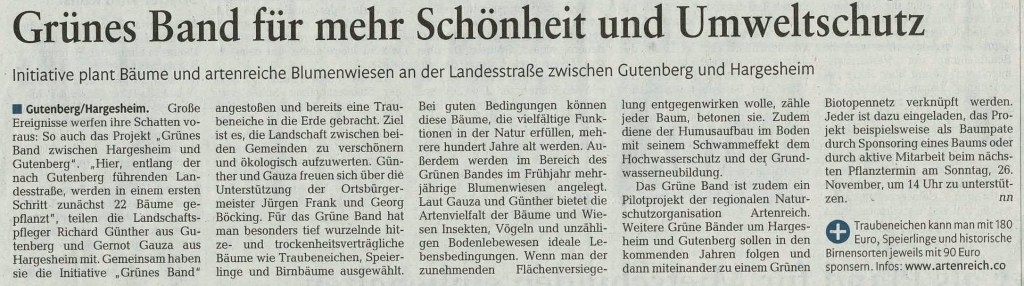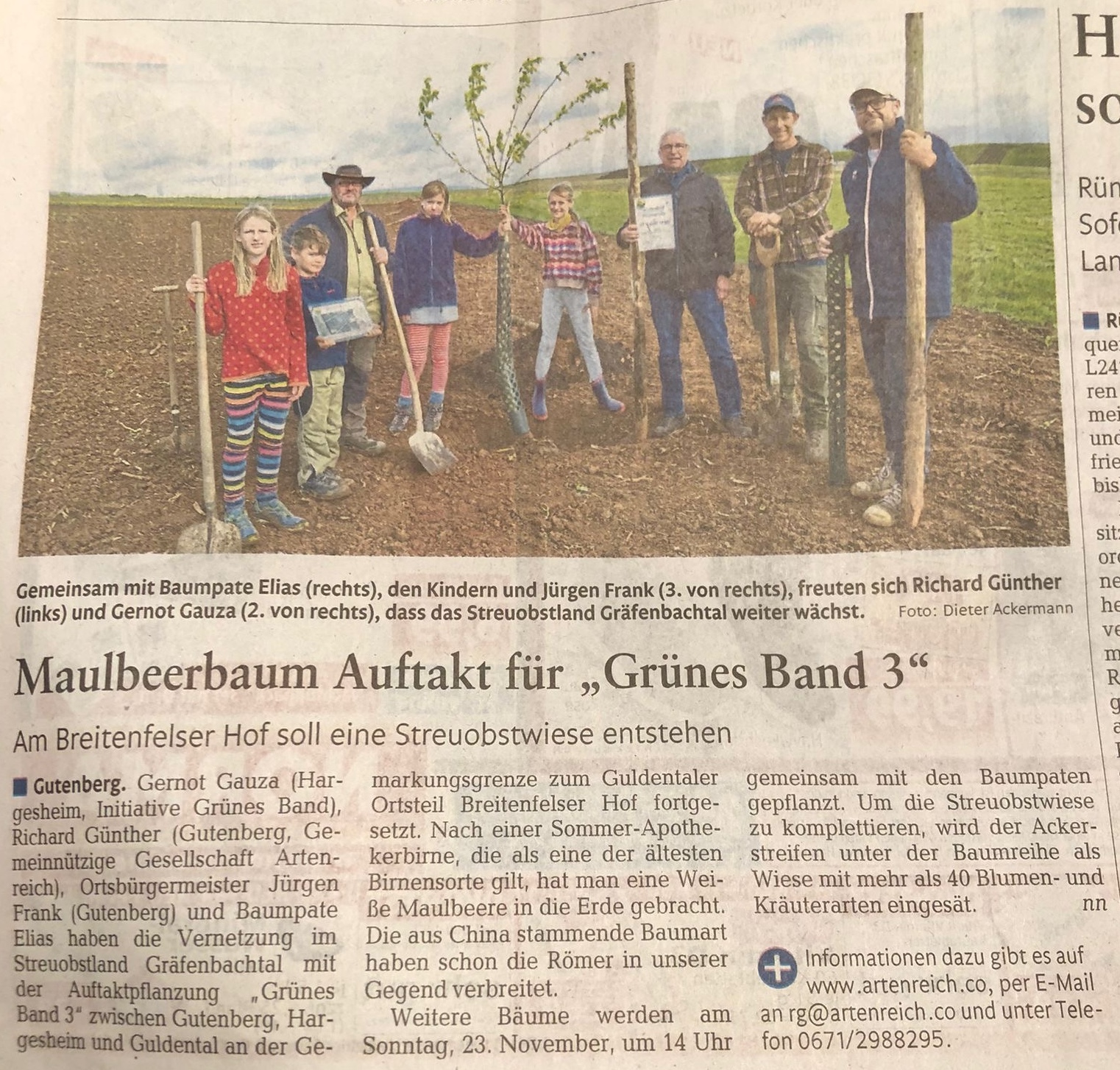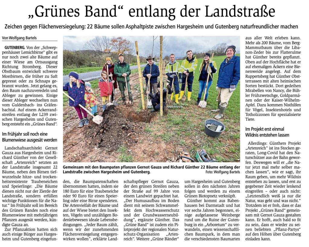 Die Initiative GrünesBand, die von Gernot Gauza aus Hargesheim und Richard Günther aus Gutenberg angestoßen wurde, um die Landschaft zwischen den beiden Ortschaften zu verschönern und ökologisch aufzuwerten, ist auf reges Interesse gestoßen, so dass einige der Baumpaten und Helfer vom letzten Jahr auch diesmal wieder dabei sein wollen.