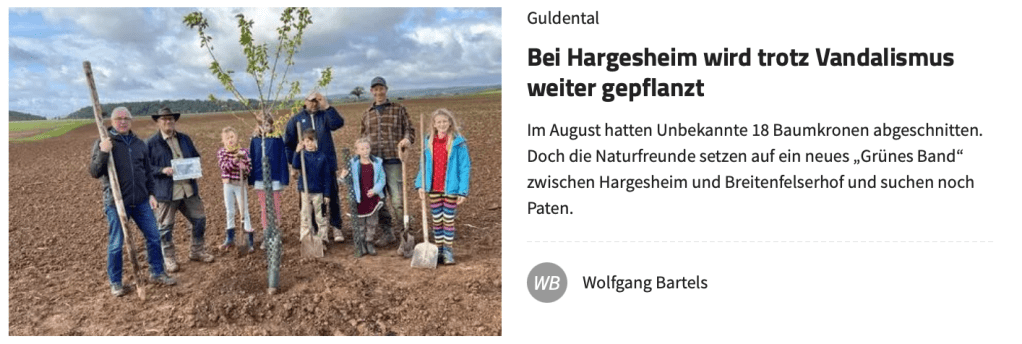 Bei Hargesheim wird trotz Vandalismus weiter gepflanzt; Im August hatten Unbekannte 18 Baumkronen abgeschnitten. Doch die Naturfreunde setzen auf ein neues „Grünes Band“ zwischen Hargesheim und Breitenfelserhof und suchen noch Paten. – Wolfgang Bartels